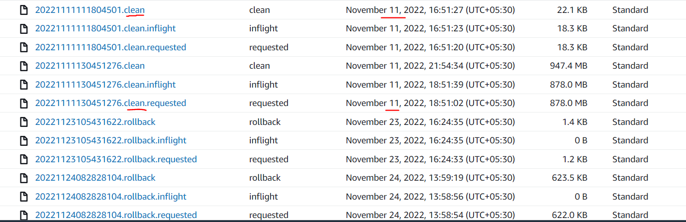 From Nov 11th, we dont see cleanup files , On Nov 11th we switched CLEANER_POLICY from KEEP_LATEST_COMMITS to KEEP_LATEST_BY_HOURS from then we see cleanup is not triggering. and log files are increasing Our Hudi Properties : DataSourceWriteOptions.TABLE_TYPE.key() -> DataSourceWriteOptions.MOR_TABLE_TYPE_OPT_VAL, DataSourceWriteOptions.RECORDKEY_FIELD.key() -> "guid", DataSourceWriteOptions.PARTITIONPATH_FIELD.key() -> "collectionName", DataSourceWriteOptions.PRECOMBINE_FIELD.key() -> "operationTime", HoodieCompactionConfig.INLINE_COMPACT_TRIGGER_STRATEGY.key() -> CompactionTriggerStrategy.TIME_ELAPSED.name, HoodieCompactionConfig.INLINE_COMPACT_TIME_DELTA_SECONDS.key() -> String.valueOf(60 * 60), HoodieCompactionConfig.CLEANER_HOURS_RETAINED.key() -> "48", HoodieCompactionConfig.CLEANER_POLICY.key() -> HoodieCleaningPolicy.KEEP_LATEST_BY_HOURS.name, HoodieCompactionConfig.ASYNC_CLEAN.key() -> "false", HoodieCompactionConfig.INLINE_COMPACT.key() -> "true", HoodieCompactionConfig.CLEANER_PARALLELISM_VALUE.key() -> "500", HoodieMetricsConfig.TURN_METRICS_ON.key() -> "true", HoodieMetricsConfig.METRICS_REPORTER_TYPE_VALUE.key() -> MetricsReporterType.DATADOG.name(), HoodieMetricsDatadogConfig.API_SITE_VALUE.key() -> "US", HoodieMetricsDatadogConfig.METRIC_PREFIX_VALUE.key() -> "tacticalnovusingest.hudi", HoodieMetricsDatadogConfig.API_KEY_SUPPLIER.key() -> "com.tr.indigo.tacticalnovusingest.utils.DatadogKeySupplier", HoodieMetadataConfig.ENABLE.key() -> "false", HoodieWriteConfig.ROLLBACK_USING_MARKERS_ENABLE.key() -> "false", HoodieMemoryConfig.MAX_MEMORY_FRACTION_FOR_COMPACTION.key() -> "0.3" //HoodieCompactionConfig.CLEANER_POLICY_PROP -> HoodieCleaningPolicy.KEEP_LATEST_FILE_VERSIONS.name @nsivabalan @yihua @dacort @jfrazee @msridhar Any updates on this. -- This is an automated message from the Apache Git Service. To respond to the message, please log on to GitHub and use the URL above to go to the specific comment. To unsubscribe, e-mail: [email protected] For queries about this service, please contact Infrastructure at: [email protected]