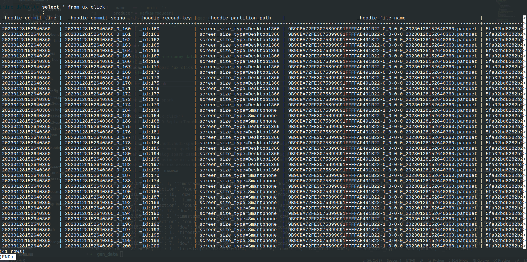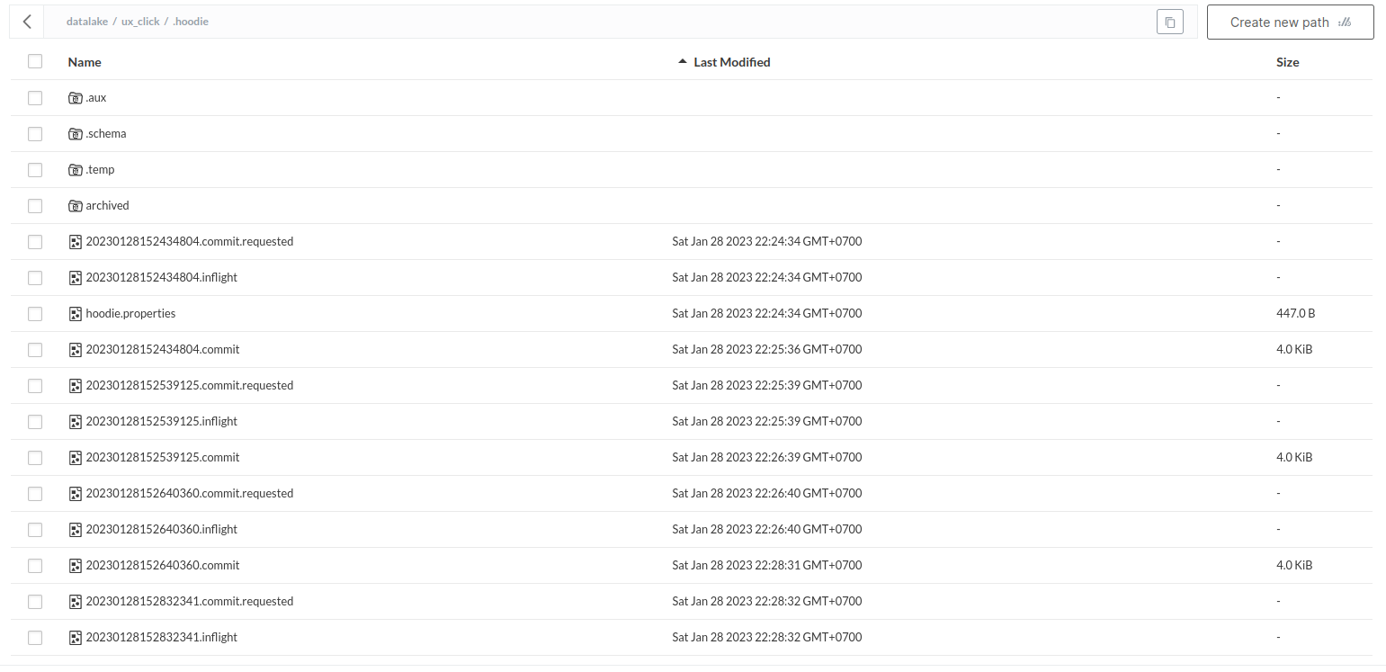 Hi @codope, thanks for the reply!! - I tried using the hudi connector but still facing the same problem, I send a records after 1s to ux_click topic. After 60s, I ingest data from ux_click topic use hudi kafka connector - When I sent 200 records to ux_click topic, I stopped - This is my minio.properties config in trino  1. I am using hudi-trino-bundle 0.11.0 2. - This is result when I run `show create table ux_click` command in trino  - I checked trino log file and it only show records of latest commit  - This is .hoodie folder in minio  => I see that trino only shows records of latest commit (20230128152832341)  => I tried running the `select * from ux_click` statement after each ingest data (after 60s hudi kafka reconnect to ingest once) and found that it only returns the records of that commit. => I want to run the `select * from ux_click` command using trino to return all the records in the hudi table -- This is an automated message from the Apache Git Service. To respond to the message, please log on to GitHub and use the URL above to go to the specific comment. To unsubscribe, e-mail: [email protected] For queries about this service, please contact Infrastructure at: [email protected]