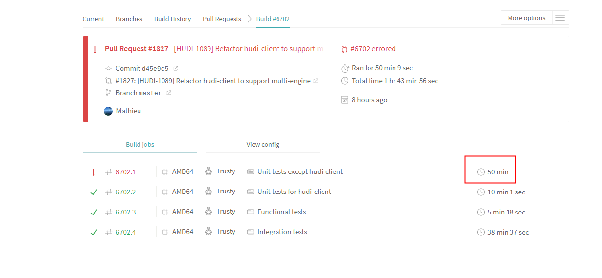 Hi, @vinothchandar thanks for your review. I'll address your concerns ASAP. The unit test should be ok. The CI failure seems caused by timeout(50min), can you help figure this out, I don't know how to adjust this threshold.  ---------------------------------------------------------------- This is an automated message from the Apache Git Service. To respond to the message, please log on to GitHub and use the URL above to go to the specific comment. For queries about this service, please contact Infrastructure at: [email protected]