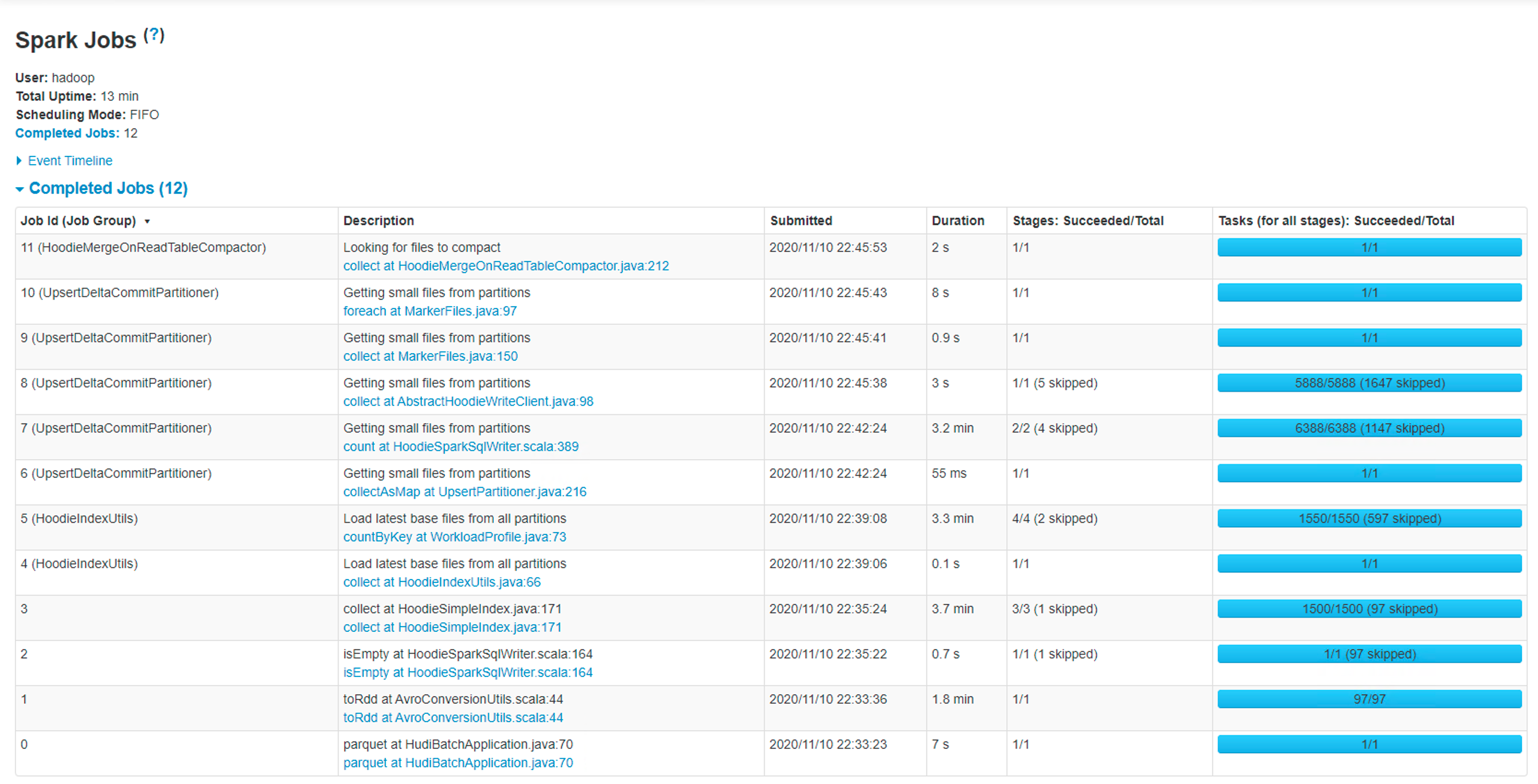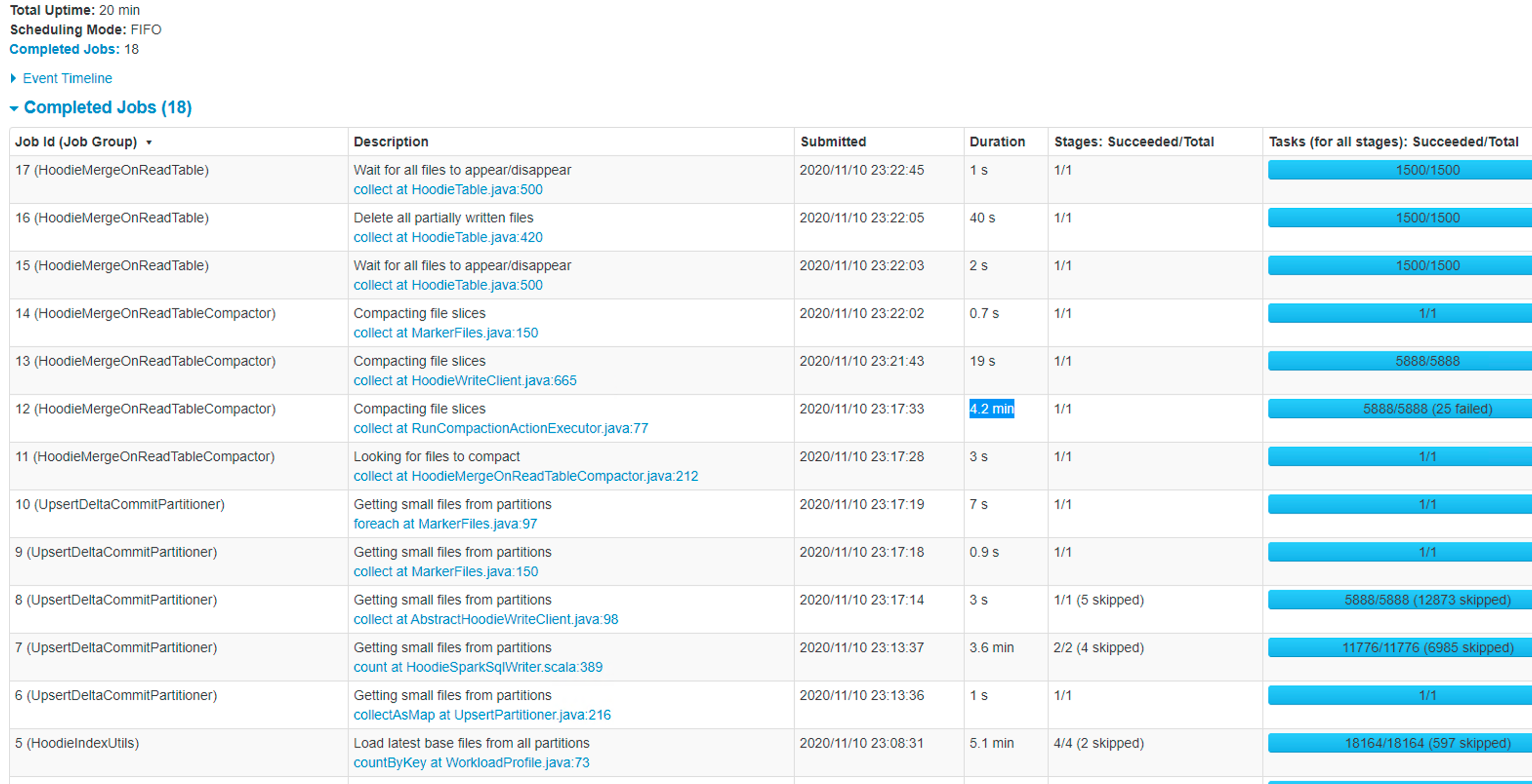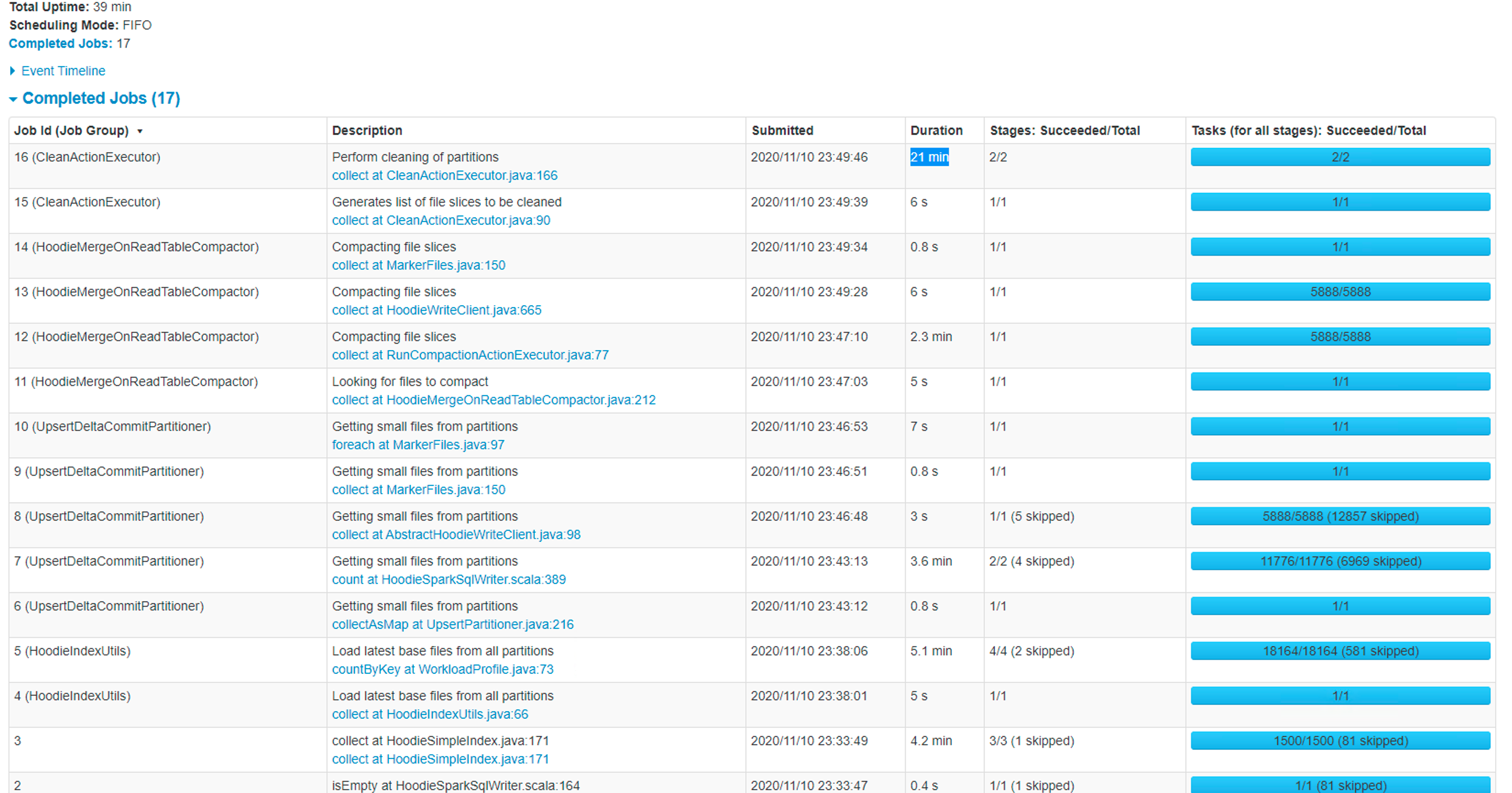 @bvaradar Thank you for your help- I tried my job with 750 Mill records insert/upsert with SIMPLE index type, I see the initial load was completed in 13 min. but the subsequent jobs were taking long. the time increasing for every run. Please see the below screenshots- First Run -Took 13 min  2ndRun Took 20 min  - In this case, it ran compaction due to that total time went up 3rd Run -39 min  - In this case, Job triggered compaction and cleaning due to that, total time wentup.. but in any case, the job time was increasing over time. the good thing is the job is completing now. how can I tune my job to get an optimal performance and predictable time? - Coming to file size - I still see small files after setting the below attributes- .option("hoodie.parquet.block.size",125829120) .option("hoodie.parquet.small.file.limit",104857600) .option("hoodie.parquet.max.file.size",125829120) - I also see a lot of GC happening in my job- ---------------------------------------------------------------- This is an automated message from the Apache Git Service. To respond to the message, please log on to GitHub and use the URL above to go to the specific comment. For queries about this service, please contact Infrastructure at: [email protected]