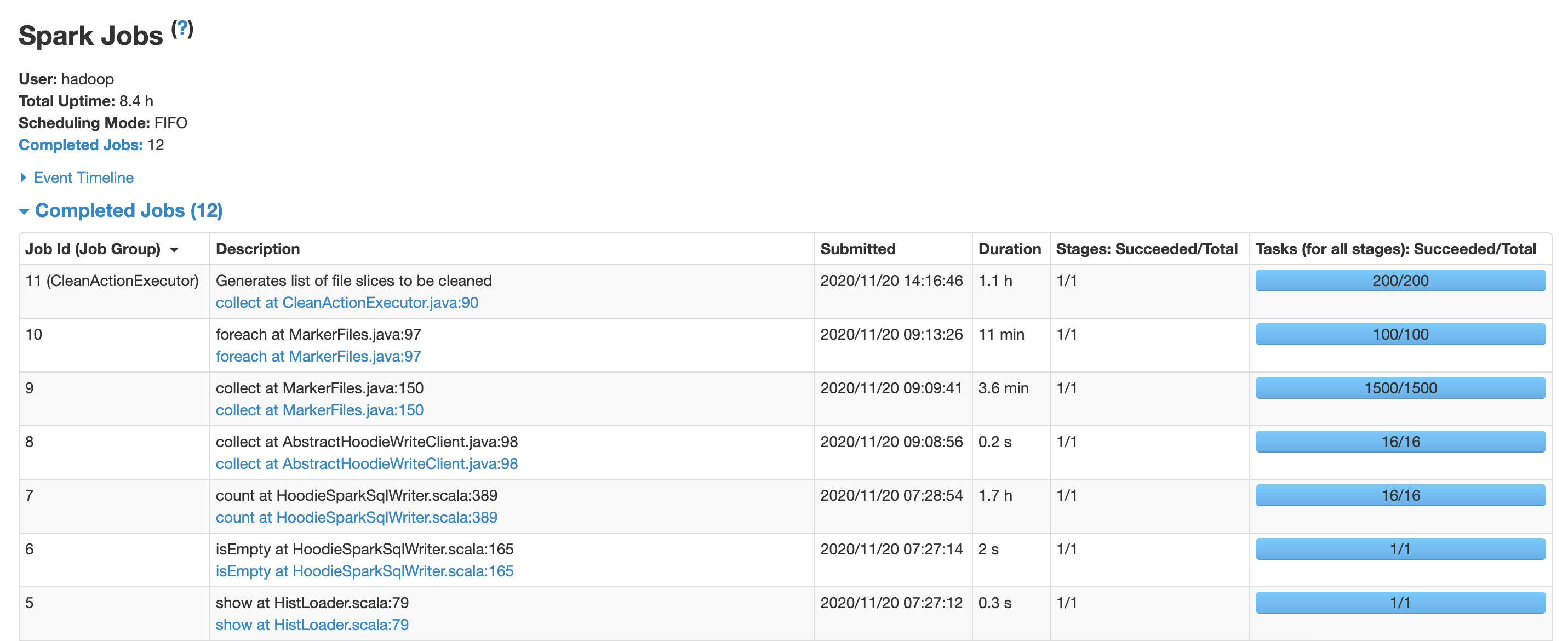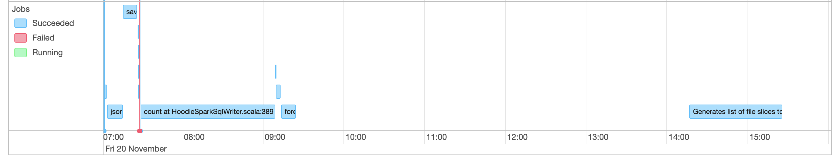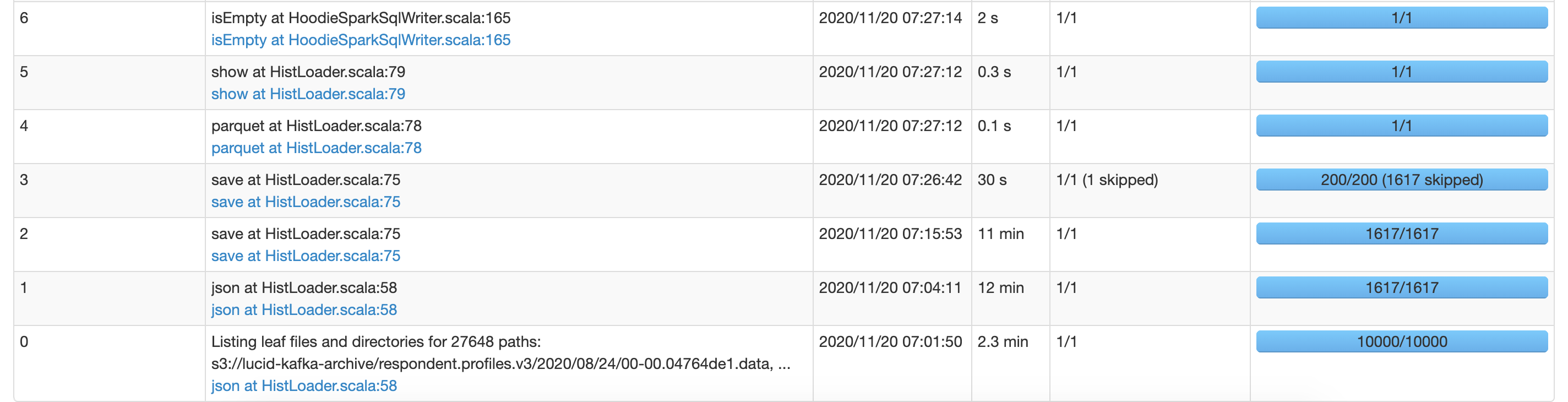 I am trying to bulk insert 5 GB parquet s3 file in a partitioned HUDI table in s3. The input parquet s3 file is written by an upstream process where in the 5 GB data is divided across 200 part files. The hudi table load process takes a long time to load this data. There is no movement in the driver logs and in some cases the log appears to be stuck for ~4 hours at one place bringing the total execution time to 8 hrs. Out of these 8 hrs, the spark UI application stages show that the processing stages take around ~3 to 4 hours approximately, but there is a huge period of time when there is no processing that is visible on the spark UI and the driver log is also stuck for ~4 hours at one place. When I try to insert in a non-partitioned HUDI table, the write to the hudi table happens in 6 minutes without any issues. Also, another observation is when I try to write to the hudi table in HDFS instead of s3, then the process completes in ~1hr. Can you please advise on as to what is happen ing here in terms of the driver log being stuck at one position and how can it be mitigated? Attached the log file where in you can see that there is no movement in the driver log. [log_2020_08_24.log](https://github.com/apache/hudi/files/5578693/log_2020_08_24.log) Below is the log snippet where in the input 5 GB parquet file is being written. This file will be used in the second half of the process to write to the Hudi table. ``` 20/11/20 07:27:12 INFO DAGScheduler: Job 3 finished: save at HistLoader.scala:75, took 29.940154 s 20/11/20 07:27:12 INFO MultipartUploadOutputStream: close closed:false s3://lucid-datalake-lt/temp_stage/_SUCCESS 20/11/20 07:27:12 INFO FileFormatWriter: Write Job fb9c88a3-d50a-4451-b623-5d23981df40e committed. ``` As advised, I am forcing a read of the above input file immediately after writing and it happens very quickly as can be seen from the logs. ``` 20/11/20 07:27:13 INFO DAGScheduler: ResultStage 6 (show at HistLoader.scala:79) finished in 0.339 s 20/11/20 07:27:13 INFO DAGScheduler: Job 5 finished: show at HistLoader.scala:79, took 0.340348 s +-----------+------------+-----------+------+--------------------+--------------------+ |survey_dbid|session_dbid|question_id|answer| respondent_id| timestamp| +-----------+------------+-----------+------+--------------------+--------------------+ | 8292560| 6120232969| 44| IN|734e0eac-53fd-455...|2020-08-24 18:32:...| | 8292560| 6120232969| 79400| 10|734e0eac-53fd-455...|2020-08-24 18:32:...| ``` Below is snippet from above attached log where it seems to be stuck for half an hour: ``` 20/11/20 07:31:45 INFO ContextCleaner: Cleaned accumulator 13 20/11/20 07:31:45 INFO BlockManagerInfo: Removed broadcast_0_piece0 on ip-10-0-5-165.fulcrumex.com:39631 in memory (size: 33.9 KB, free: 57.8 GB) 20/11/20 08:04:17 INFO BlockManagerInfo: Added rdd_27_0 in memory on ip-10-0-5-170.fulcrumex.com:39049 (size: 719.7 KB, free: 51.4 GB) 20/11/20 08:04:17 INFO TaskSetManager: Starting task 10.0 in stage 8.0 (TID 13447, ip-10-0-5-170.fulcrumex.com, executor 11, partition 10, RACK_LOCAL, 9867 bytes) ``` Below is snippet from above attached log where it seems to be stuck for ~4 hrs 45 mins: ``` 20/11/20 09:28:11 INFO ContextCleaner: Cleaned accumulator 206 20/11/20 09:28:11 INFO ContextCleaner: Cleaned accumulator 208 20/11/20 14:16:46 INFO SparkContext: Starting job: collect at CleanActionExecutor.java:90 20/11/20 14:16:46 INFO DAGScheduler: Got job 11 (collect at CleanActionExecutor.java:90) with 200 output partitions ``` Following in the configuration that I am using: ``` AWS EMR - Master - r5.4x large - 10 Core node - r5.4x large - Release label:emr-5.31.0 - Spark - 2.4.6 - On acocunt of above the hudi version is 0.6.0 (hudi-spark-bundle_2.11-0.6.0-amzn-0.jar) ``` Spark Customizations: I changedthe below on account of containers getting killed by yarn during execution on account of less memory. ``` "spark.executor.memory":"98971M", "spark.driver.memory":"98971M" "spark.executor.cores":"1" - I reduced the number of cores from the default 4 to 1, assuming that each executor will have more memory at its disposal on account of the memory issues that I was seeing earlier. ``` Hudi table Load Options: ``` HoodieWriteConfig.TABLE_NAME -> "session_answers", DataSourceWriteOptions.TABLE_TYPE_OPT_KEY -> DataSourceWriteOptions.COW_TABLE_TYPE_OPT_VAL, DataSourceWriteOptions.KEYGENERATOR_CLASS_OPT_KEY -> "org.apache.hudi.keygen.ComplexKeyGenerator", DataSourceWriteOptions.RECORDKEY_FIELD_OPT_KEY -> "session_dbid,question_id", DataSourceWriteOptions.PARTITIONPATH_FIELD_OPT_KEY -> "survey_dbid", DataSourceWriteOptions.PRECOMBINE_FIELD_OPT_KEY -> "timestamp", "hoodie.bulkinsert.shuffle.parallelism" -> "20", --- Initially I did not set it. But the process took even longer around 11 hrs with a lot of containers getting killed by yarn. So, I set to 20. "hoodie.bulkinsert.sort.mode" -> "NONE", DataSourceWriteOptions.OPERATION_OPT_KEY -> DataSourceWriteOptions.BULK_INSERT_OPERATION_OPT_VAL ``` Below is the code that I am running: ``` package com.lucidhq.etl.reports import org.apache.spark.sql.{ DataFrame, SaveMode, SparkSession } import org.apache.spark.sql.functions.{ col, udf, trim, split, size, max, lit, when, date_format, concat_ws, collect_list, first } import scala.collection.mutable.ListBuffer import org.apache.spark.sql.SaveMode import org.apache.spark.sql.functions._ import org.apache.hudi.{ DataSourceWriteOptions, DataSourceReadOptions } import org.apache.hudi.config.HoodieWriteConfig //import org.apache.hudi.hive.MultiPartKeysValueExtractor import scala.reflect.io.Directory import java.io.File import org.apache.log4j.Logger object HistLoader { val sourceFilePrefix = "s3://lucid-kafka-archive/respondent.profiles.v3" val intermediateStagePath = "s3://lucid-datalake-lt/temp_stage/" val logger = Logger.getLogger(getClass.getName) var basePath = "" var processDate = "" def main(arg: Array[String]): Unit = { val spark = SparkSession.builder. appName("Sessions_hist_loa
