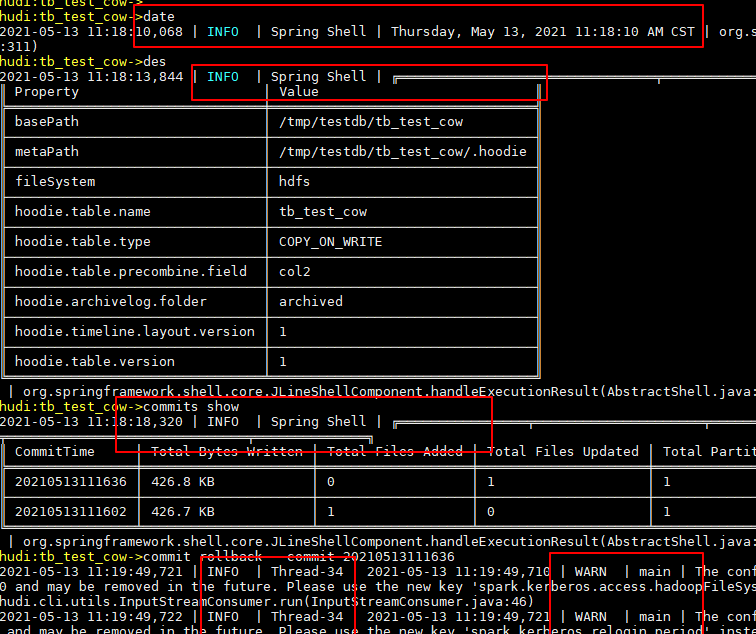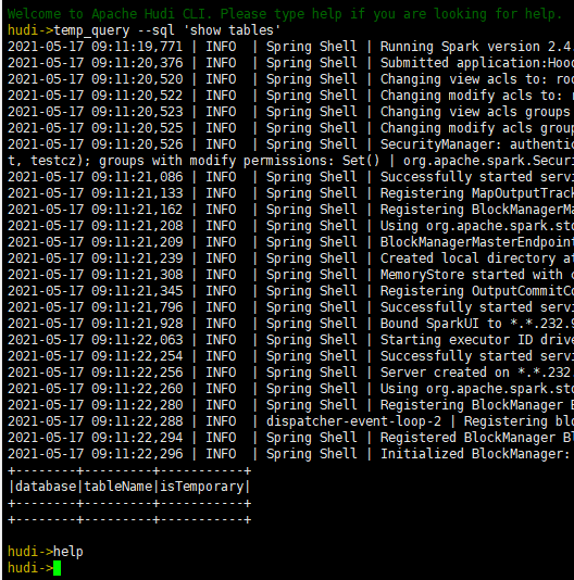 **Describe the problem you faced** When using hudi-cli.sh to manage hudi table, once we run the temp_* command, there won`t be any response print out for any other command. **To Reproduce** Steps to reproduce the behavior: 1.Run hudi-cli.sh. 2.Execute command: temp_query --sql 'show tables'. 3.Excute command:help. 4.The result won`t print out. **Expected behavior** The other commands` result won`t be compacted by temp command and print out normal as before. **Environment Description** * Hudi version : from 0.7 to 0.8 * Spark version : from 2.4.5 to 3.1.1 * Hive version : 3.1.0 * Hadoop version : 3.1.1 * Storage (HDFS/S3/GCS..) : HDFS * Running on Docker? (yes/no) :no **Additional context** List some info we found so far as below: The issue behavior  This mainly caused by the log level is hard code to ERROR in SparkTempViewProvider.java After we delete the hard code level the result can print our but there`s still some issue like below:  Sames after run temp command, the logHandler changed from JLineLogHandler to SLF4JBridgeHandler and we don`t know how to rollback. -- This is an automated message from the Apache Git Service. To respond to the message, please log on to GitHub and use the URL above to go to the specific comment. For queries about this service, please contact Infrastructure at: [email protected]