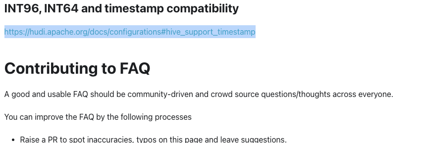 I do think there are some.  e.g https://hudi.apache.org/docs/configurations#hive_support_timestamp instead of https://hudi.apache.org/docs/configurations/#hoodiedatasourcehive_syncsupport_timestamp -- This is an automated message from the Apache Git Service. To respond to the message, please log on to GitHub and use the URL above to go to the specific comment. To unsubscribe, e-mail: [email protected] For queries about this service, please contact Infrastructure at: [email protected]