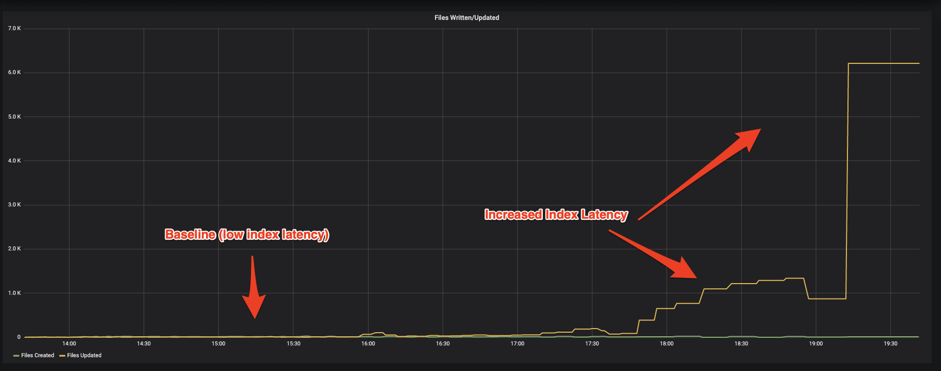 I would also like to show some graphs comparing the baseline and what they look like during these latency spikes. This is a graph of the number of files Created vs. Updated per batch (`commit.totalFilesInsert` and `commit.totalFilesUpdate` respectively). The number of updated files explodes:  The next graph shows that the number of bytes being written is magnitudes higher than baseline, according to Hudi metrics (`commit.totalBytesWritten`):  -- This is an automated message from the Apache Git Service. To respond to the message, please log on to GitHub and use the URL above to go to the specific comment. To unsubscribe, e-mail: [email protected] For queries about this service, please contact Infrastructure at: [email protected]
