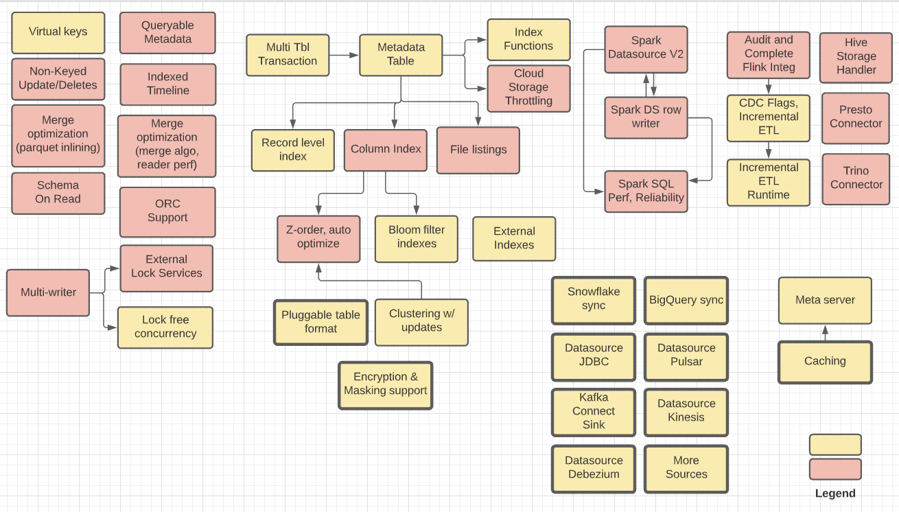This is my bad. @vkingnew thanks for calling out. :) Will update in a week or so. Our blog should paint a picture for where we are headed. https://hudi.apache.org/blog/2021/07/21/streaming-data-lake-platform This is what I have managed to draft so far, if you want a sneak peek.  Arrows are dependencies. Been trying to unclutter them and layout a plan. So thats taking sometime. -- This is an automated message from the Apache Git Service. To respond to the message, please log on to GitHub and use the URL above to go to the specific comment. To unsubscribe, e-mail: [email protected] For queries about this service, please contact Infrastructure at: [email protected]