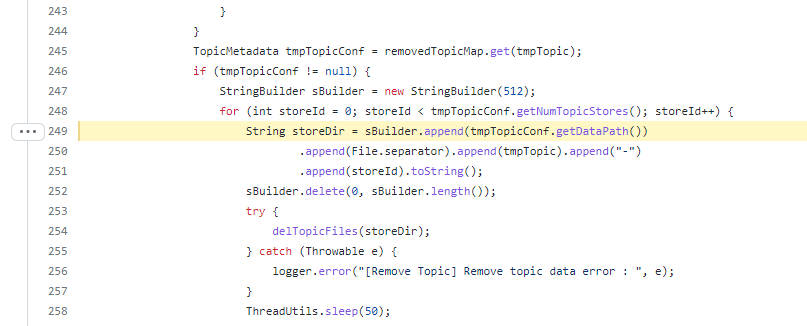 An implementation bug resulted in: 1. https://github.com/apache/inlong/blob/master/inlong-tubemq/tubemq-server/src/main/java/org/apache/inlong/tubemq/server/broker/msgstore/MessageStoreManager.java#L249  -- This is an automated message from the Apache Git Service. To respond to the message, please log on to GitHub and use the URL above to go to the specific comment. To unsubscribe, e-mail: [email protected] For queries about this service, please contact Infrastructure at: [email protected]