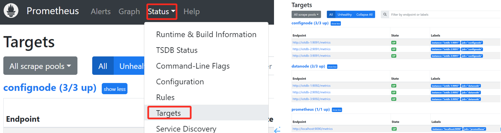 Prometheus and click on the Target interface under Status. When you see that