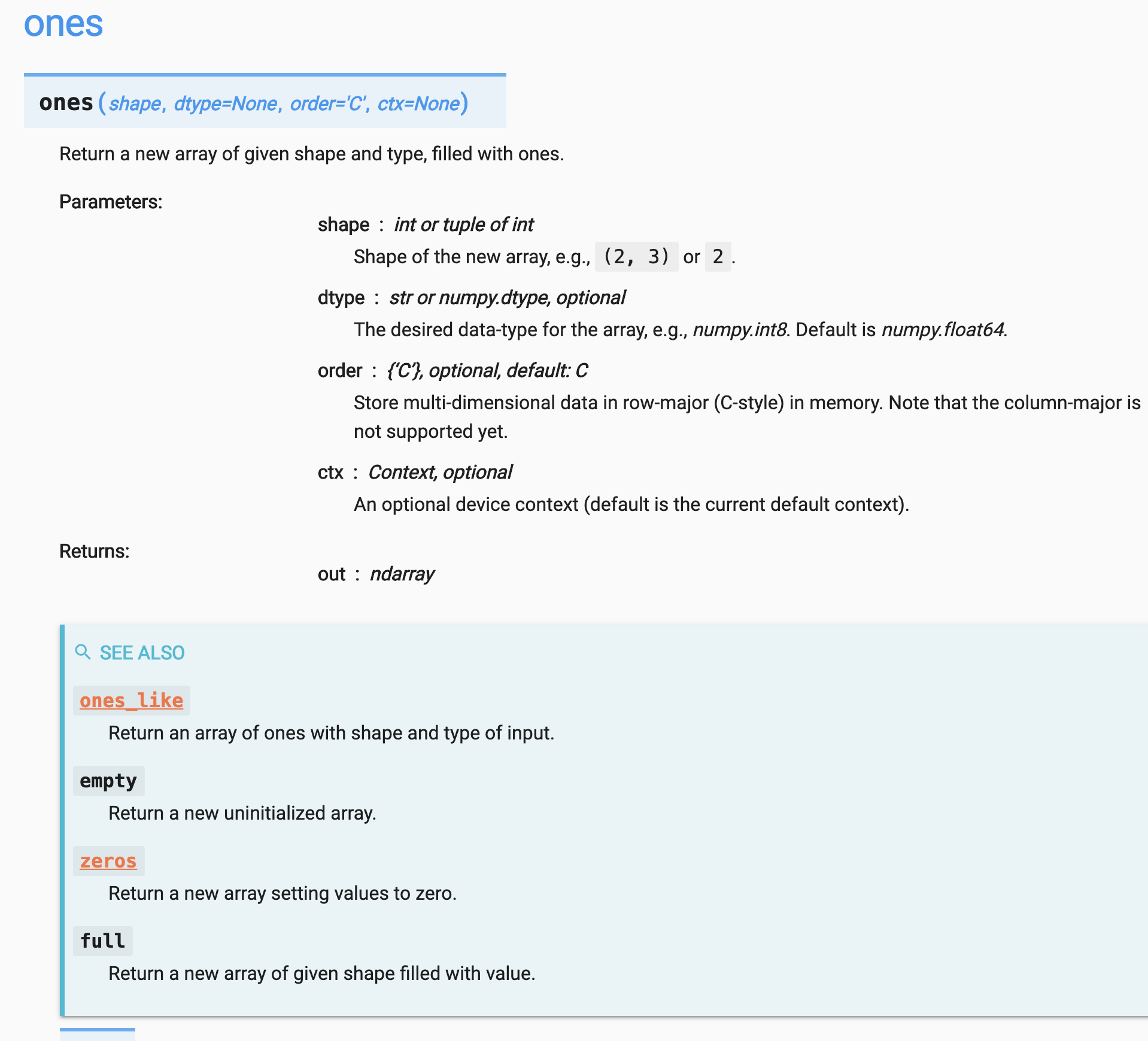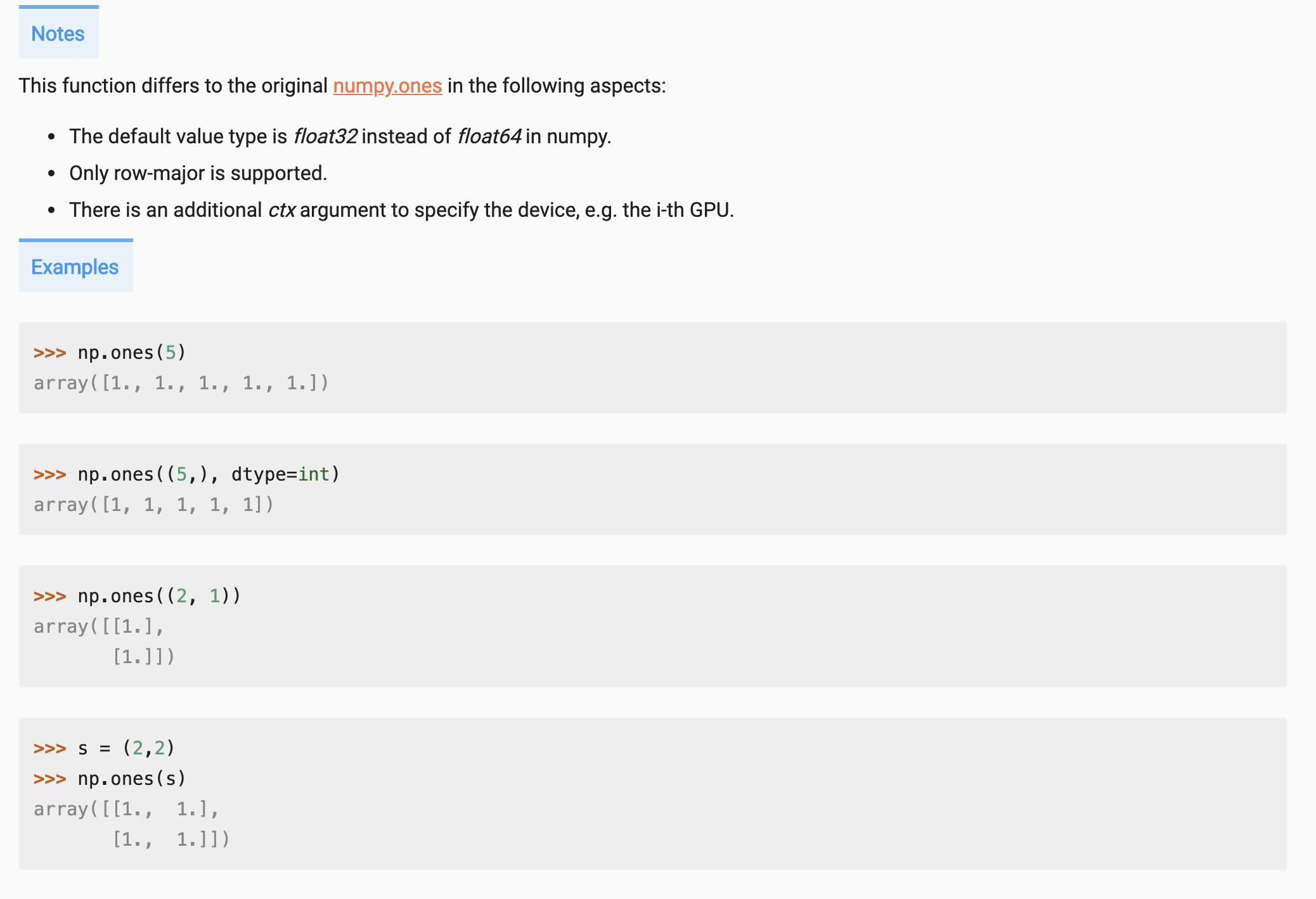 mli opened a new pull request #15347: [numpy] improve np.ones document URL: https://github.com/apache/incubator-mxnet/pull/15347 An example to improve the numpy.ones documents. No need to be merged. It makes the following changes: 1. a customized function signature 2. added back the order argument, so we can generate an error to say that order='F' is not supported, but codes with order='C' should still run 3. copied all other docs from numpy, but need to check the codes in the example section 4. used the 'notes' section to specify the difference between numpy.ones btw, I enabled the numpydoc ext in sphinx, please follow this guideline to write documents https://numpydoc.readthedocs.io/en/latest/ (I need to update our theme as well...)   @haojin2 @reminisce
