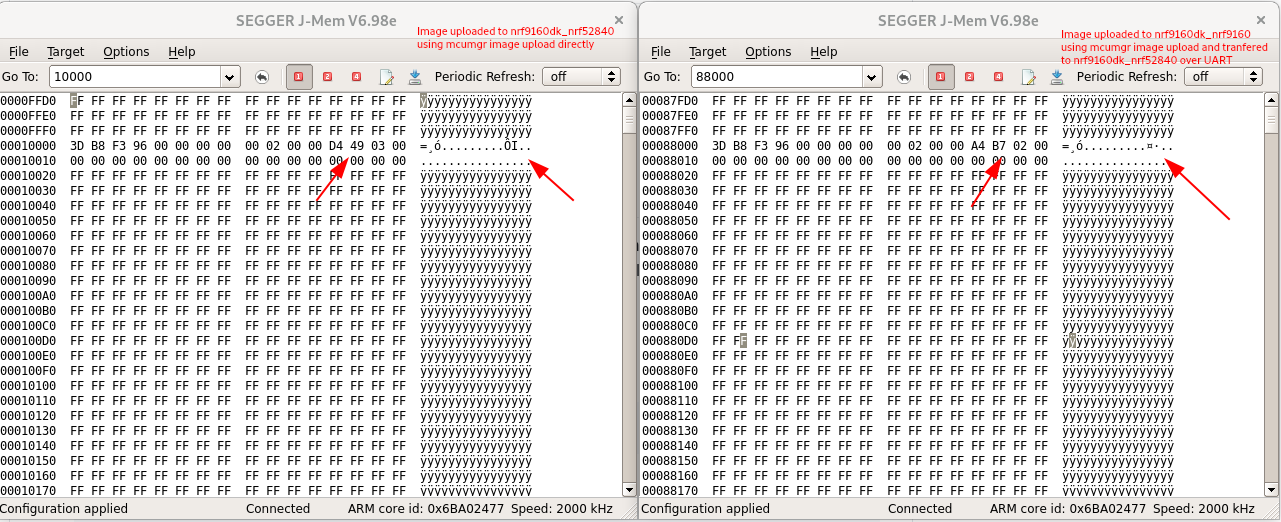 Hello again! I'm working on transferring images to the nrf52840 by uploading it to nrf9160 and sending it over UART, on the nrf9160dk. When the image has gone through the 91 it is not bootable however directly uploading it to the 52 works perfectly. To see if there was a difference between the images I transferred the same image twice to the 52. The first way was using mcumgr upload image to the 52 and swapping it to slot 0, and the second way was transferring to 91 using the same command and then sending it over the uart to slot 1. When calling mcuboot in the internal shell it lists both images, and they have the same size. Requesting an upgrade prints the error message of "image in slot 1 is not valid" when rebooted. Looking at the memory on the 52 gave these results which have some differences that might be the cause of the image being invalid.   Another small problem is that only calling mcuboot in the internal shell lists the images, calling mcumgr image list only lists slot 0 after slot 1 being filled over uart. @de-nordic gave a posible reason for this here [https://github.com/apache/mynewt-mcumgr/issues/127](url) Thanks a lot for any help on this! -- This is an automated message from the Apache Git Service. To respond to the message, please log on to GitHub and use the URL above to go to the specific comment. For queries about this service, please contact Infrastructure at: [email protected]