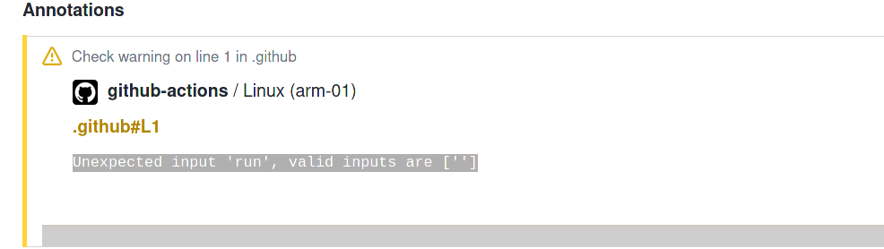 ## Summary The github action that we had defined for running builds in the container did not have the input `run` defined, so there were warning annotations on every build. ## Impact Removes warning from all the Linux builds ## Testing The warning annotation should not exist anymore in the CI check.  ---------------------------------------------------------------- This is an automated message from the Apache Git Service. To respond to the message, please log on to GitHub and use the URL above to go to the specific comment. For queries about this service, please contact Infrastructure at: [email protected]