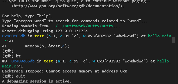 > use hardcode to mask high bit 31-30 for A0 ,it work,but gdb just can see the frist call stack,and gdb output `Backtrace stopped: Cannot access memory at address 0x0`  @Ouss4 and @anjiahao1 how about we patch gdb backtrace code to remove the high two bit from frame point? Instead do the trick inside OpenOCD or minidumpsever.py: https://github.com/espressif/openocd-esp32/blob/9d736dcba9aedd75933e873a644112a01e3d7f6c/src/rtos/rtos_freertos_stackings.c#L891 -- This is an automated message from the Apache Git Service. To respond to the message, please log on to GitHub and use the URL above to go to the specific comment. To unsubscribe, e-mail: [email protected] For queries about this service, please contact Infrastructure at: [email protected]
