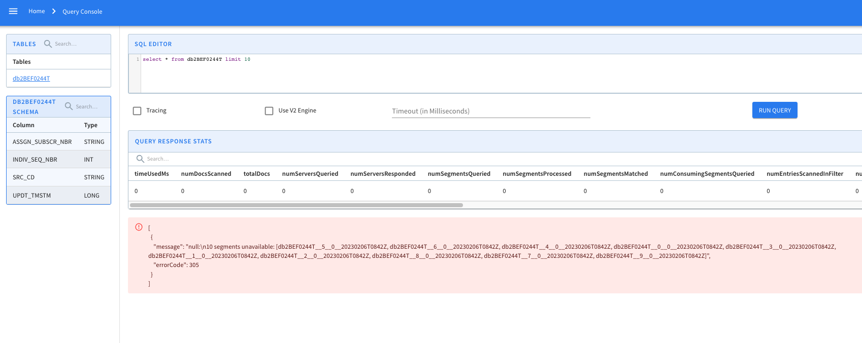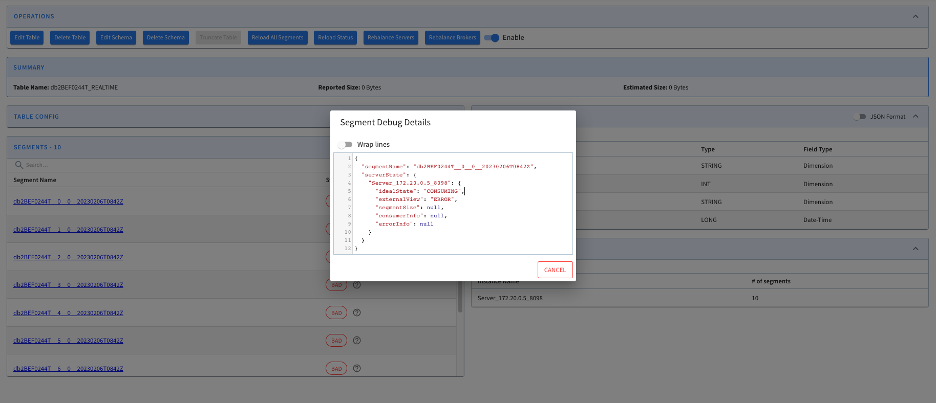 I have updated table name as you suggested. here is the controller logs.   ``` 2023/02/06 08:42:22.869 ERROR [MessageGenerationPhase] [HelixController-pipeline-default-PinotCluster-(73e53422_DEFAULT)] Event 73e53422_DEFAULT : Unable to find a next state for resource: db2BEF0244T_REALTIME partition: db2BEF0244T__7__0__20230206T0842Z from stateModelDefinitionclass org.apache.helix.model.StateModelDefinition from:ERROR to:CONSUMING 2023/02/06 08:42:22.869 ERROR [MessageGenerationPhase] [HelixController-pipeline-default-PinotCluster-(73e53422_DEFAULT)] Event 73e53422_DEFAULT : Unable to find a next state for resource: db2BEF0244T_REALTIME partition: db2BEF0244T__8__0__20230206T0842Z from stateModelDefinitionclass org.apache.helix.model.StateModelDefinition from:ERROR to:CONSUMING 2023/02/06 08:42:22.869 ERROR [MessageGenerationPhase] [HelixController-pipeline-default-PinotCluster-(73e53422_DEFAULT)] Event 73e53422_DEFAULT : Unable to find a next state for resource: db2BEF0244T_REALTIME partition: db2BEF0244T__9__0__20230206T0842Z from stateModelDefinitionclass org.apache.helix.model.StateModelDefinition from:ERROR to:CONSUMING 2023/02/06 08:42:22.898 ERROR [MessageGenerationPhase] [HelixController-pipeline-default-PinotCluster-(bd7a73e7_DEFAULT)] Event bd7a73e7_DEFAULT : Unable to find a next state for resource: db2BEF0244T_REALTIME partition: db2BEF0244T__0__0__20230206T0842Z from stateModelDefinitionclass org.apache.helix.model.StateModelDefinition from:ERROR to:CONSUMING 2023/02/06 08:42:22.899 ERROR [MessageGenerationPhase] [HelixController-pipeline-default-PinotCluster-(bd7a73e7_DEFAULT)] Event bd7a73e7_DEFAULT : Unable to find a next state for resource: db2BEF0244T_REALTIME partition: db2BEF0244T__1__0__20230206T0842Z from stateModelDefinitionclass org.apache.helix.model.StateModelDefinition from:ERROR to:CONSUMING 2023/02/06 08:42:22.899 ERROR [MessageGenerationPhase] [HelixController-pipeline-default-PinotCluster-(bd7a73e7_DEFAULT)] Event bd7a73e7_DEFAULT : Unable to find a next state for resource: db2BEF0244T_REALTIME partition: db2BEF0244T__2__0__20230206T0842Z from stateModelDefinitionclass org.apache.helix.model.StateModelDefinition from:ERROR to:CONSUMING 2023/02/06 08:42:22.899 ERROR [MessageGenerationPhase] [HelixController-pipeline-default-PinotCluster-(bd7a73e7_DEFAULT)] Event bd7a73e7_DEFAULT : Unable to find a next state for resource: db2BEF0244T_REALTIME partition: db2BEF0244T__3__0__20230206T0842Z from stateModelDefinitionclass org.apache.helix.model.StateModelDefinition from:ERROR to:CONSUMING 2023/02/06 08:42:22.899 ERROR [MessageGenerationPhase] [HelixController-pipeline-default-PinotCluster-(bd7a73e7_DEFAULT)] Event bd7a73e7_DEFAULT : Unable to find a next state for resource: db2BEF0244T_REALTIME partition: db2BEF0244T__4__0__20230206T0842Z from stateModelDefinitionclass org.apache.helix.model.StateModelDefinition from:ERROR to:CONSUMING 2023/02/06 08:42:22.899 ERROR [MessageGenerationPhase] [HelixController-pipeline-default-PinotCluster-(bd7a73e7_DEFAULT)] Event bd7a73e7_DEFAULT : Unable to find a next state for resource: db2BEF0244T_REALTIME partition: db2BEF0244T__5__0__20230206T0842Z from stateModelDefinitionclass org.apache.helix.model.StateModelDefinition from:ERROR to:CONSUMING 2023/02/06 08:42:22.899 ERROR [MessageGenerationPhase] [HelixController-pipeline-default-PinotCluster-(bd7a73e7_DEFAULT)] Event bd7a73e7_DEFAULT : Unable to find a next state for resource: db2BEF0244T_REALTIME partition: db2BEF0244T__6__0__20230206T0842Z from stateModelDefinitionclass org.apache.helix.model.StateModelDefinition from:ERROR to:CONSUMING 2023/02/06 08:42:22.899 ERROR [MessageGenerationPhase] [HelixController-pipeline-default-PinotCluster-(bd7a73e7_DEFAULT)] Event bd7a73e7_DEFAULT : Unable to find a next state for resource: db2BEF0244T_REALTIME partition: db2BEF0244T__7__0__20230206T0842Z from stateModelDefinitionclass org.apache.helix.model.StateModelDefinition from:ERROR to:CONSUMING 2023/02/06 08:42:22.899 ERROR [MessageGenerationPhase] [HelixController-pipeline-default-PinotCluster-(bd7a73e7_DEFAULT)] Event bd7a73e7_DEFAULT : Unable to find a next state for resource: db2BEF0244T_REALTIME partition: db2BEF0244T__8__0__20230206T0842Z from stateModelDefinitionclass org.apache.helix.model.StateModelDefinition from:ERROR to:CONSUMING 2023/02/06 08:42:22.899 ERROR [MessageGenerationPhase] [HelixController-pipeline-default-PinotCluster-(bd7a73e7_DEFAULT)] Event bd7a73e7_DEFAULT : Unable to find a next state for resource: db2BEF0244T_REALTIME partition: db2BEF0244T__9__0__20230206T0842Z from stateModelDefinitionclass org.apache.helix.model.StateModelDefinition from:ERROR to:CONSUMING ``` -- This is an automated message from the Apache Git Service. To respond to the message, please log on to GitHub and use the URL above to go to the specific comment. To unsubscribe, e-mail: [email protected] For queries about this service, please contact Infrastructure at: [email protected] --------------------------------------------------------------------- To unsubscribe, e-mail: [email protected] For additional commands, e-mail: [email protected]