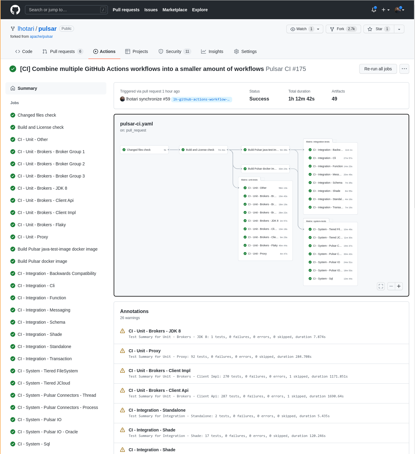 The workflow refactoring is now ready. I'll prepare a PR to apache/pulsar. Here's a screenshot of the combined workflow:  -- This is an automated message from the Apache Git Service. To respond to the message, please log on to GitHub and use the URL above to go to the specific comment. To unsubscribe, e-mail: [email protected] For queries about this service, please contact Infrastructure at: [email protected]