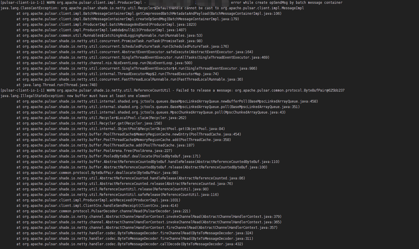 **Describe the bug** Error while create opSendMsg by batch message containe, program exit. **To Reproduce** Steps to reproduce the behavior: 1. Start consumer to sub 1000 topics of 1 namespace. 2. Start producer to pub message in 64 threads, per thread pub a part of topics. **Expected behavior** **Screenshots**  **Desktop (please complete the following information):** - OS: aarch64 GNU/Linux **Additional context** Add any other context about the problem here. -- This is an automated message from the Apache Git Service. To respond to the message, please log on to GitHub and use the URL above to go to the specific comment. To unsubscribe, e-mail: [email protected] For queries about this service, please contact Infrastructure at: [email protected]