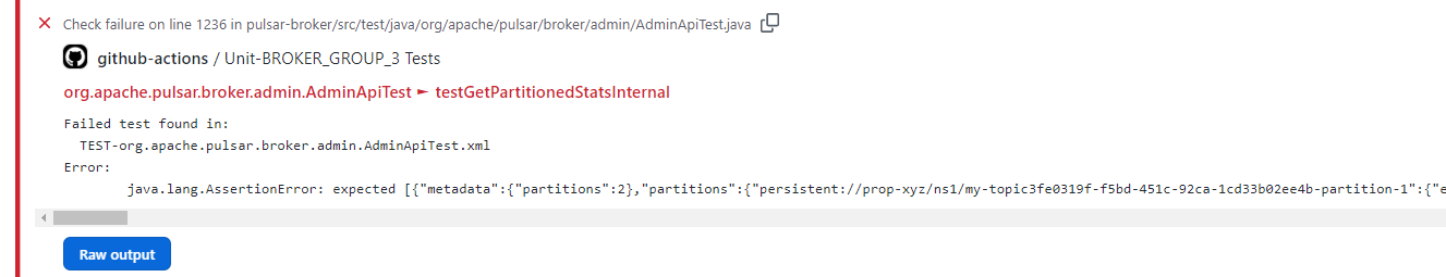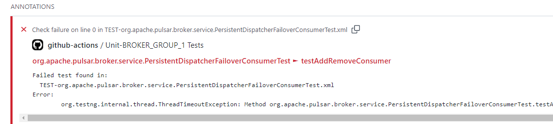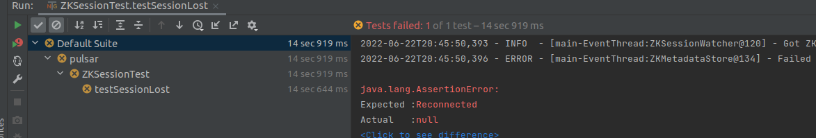 org.apache.pulsar.broker.admin.AdminApiTest ► testGetPartitionedStatsInternal:  Successfully run multiple times in my local environment:  org.apache.pulsar.broker.service.PersistentDispatcherFailoverConsumerTest ► testAddRemoveConsumer:  Successfully run multiple times in my local environment:  org.apache.pulsar.metadata.ZKSessionTest ► testSessionLost:  Runs successfully many times in my local environment, but occasionally fails:   -- This is an automated message from the Apache Git Service. To respond to the message, please log on to GitHub and use the URL above to go to the specific comment. To unsubscribe, e-mail: [email protected] For queries about this service, please contact Infrastructure at: [email protected]