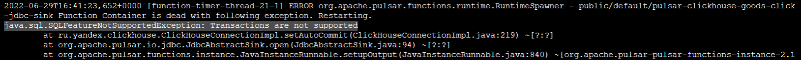 **Describe the bug** I use standalone mode to start pulsar and plan to localrun sink to clickhouse, but when after running command './bin/pulsar-admin sinks localrun --archive ./connectors/pulsar-io-jdbc-clickhouse-2.10.0.nar --inputs public/default/mail_stat_goods_click_sink --name pulsar-clickhouse-goods-click-jdbc-sink --sink-config-file ./connectors/pulsar-clickhouse-goods-click-jdbc-sink.yaml --parallelism 1', occurs an exception of 'java.sql.SQLFeatureNotSupportedException: Transactions are not supported'  **To Reproduce** Steps to reproduce the behavior: 1.before reproduce, you should add the schema ```shell ./bin/pulsar-admin schemas upload mail_stat_goods_click_sink -f ./connectors/goods-click.json ``` 2.schema ```json { "type": "AVRO", "schema": "{\"type\":\"record\",\"name\":\"GoodClickRecord\",\"namespace\":\"com.makro.mall.stat.pojo.entity\",\"fields\":[{\"name\":\"channel\",\"type\":[\"null\",\"string\"],\"default\":null},{\"name\":\"goodsCode\",\"type\":[\"null\",\"string\"],\"default\":null},{\"name\":\"isNew\",\"type\":[\"null\",\"int\"],\"default\":null},{\"name\":\"memberNo\",\"type\":[\"null\",\"string\"],\"default\":null},{\"name\":\"memberType\",\"type\":[\"null\",\"string\"],\"default\":null},{\"name\":\"mmCode\",\"type\":[\"null\",\"string\"],\"default\":null},{\"name\":\"pageNo\",\"type\":[\"null\",\"string\"],\"default\":null},{\"name\":\"publishType\",\"type\":[\"null\",\"string\"],\"default\":null},{\"name\":\"storeCode\",\"type\":[\"null\",\"string\"],\"default\":null},{\"name\":\"bizId\",\"type\":[\"null\",\"string\"],\"default\":null},{\"name\":\"browser\",\"type\":[\"null\",\"string\"],\"default\":null},{\"name\":\"browserVersion\",\"type\":[\"null\",\"string\"],\"default\":null},{\"name\ ":\"engine\",\"type\":[\"null\",\"string\"],\"default\":null},{\"name\":\"engineVersion\",\"type\":[\"null\",\"string\"],\"default\":null},{\"name\":\"event\",\"type\":[\"null\",\"string\"],\"default\":null},{\"name\":\"eventDate\",\"type\":[\"null\",{\"type\":\"record\",\"name\":\"Date\",\"namespace\":\"java.util\",\"fields\":[]}],\"default\":null},{\"name\":\"ip\",\"type\":[\"null\",\"string\"],\"default\":null},{\"name\":\"mobile\",\"type\":[\"null\",\"int\"],\"default\":null},{\"name\":\"os\",\"type\":[\"null\",\"string\"],\"default\":null},{\"name\":\"osVersion\",\"type\":[\"null\",\"string\"],\"default\":null},{\"name\":\"platform\",\"type\":[\"null\",\"string\"],\"default\":null},{\"name\":\"referer\",\"type\":[\"null\",\"string\"],\"default\":null},{\"name\":\"totalCount\",\"type\":[\"null\",\"long\"],\"default\":null},{\"name\":\"ts\",\"type\":[\"null\",\"long\"],\"default\":null},{\"name\":\"userAgent\",\"type\":[\"null\",\"string\"],\"default\":null},{\"name\":\"uuid\",\" type\":[\"null\",\"string\"],\"default\":null}]}", "properties": {} } ``` 3.localrun the sink to clickhouse ```shell ./bin/pulsar-admin sinks localrun --archive ./connectors/pulsar-io-jdbc-clickhouse-2.10.0.nar --inputs public/default/mail_stat_goods_click_sink --name pulsar-clickhouse-goods-click-jdbc-sink --sink-config-file ./connectors/pulsar-clickhouse-goods-click-jdbc-sink.yaml --parallelism 1 ``` 4. See error **Expected behavior** It can successfully run the sink to clickhouse, I think the problem is **JdbcAbstractSink** setAutoCommit(false) leads to the exception, cause clickhouse doesn't support transactions, in the jdbc connection class you can see it throws **'java.sql.SQLFeatureNotSupportedException: Transactions are not supported'** while setting autocommit false, I wonder if we can set this option in config file to avoid this error? Such as settting autocommit:true  **Screenshots**  **Desktop (please complete the following information):** - OS: Centos 8, Docker **Additional context** Add any other context about the problem here. -- This is an automated message from the Apache Git Service. To respond to the message, please log on to GitHub and use the URL above to go to the specific comment. To unsubscribe, e-mail: [email protected] For queries about this service, please contact Infrastructure at: [email protected]