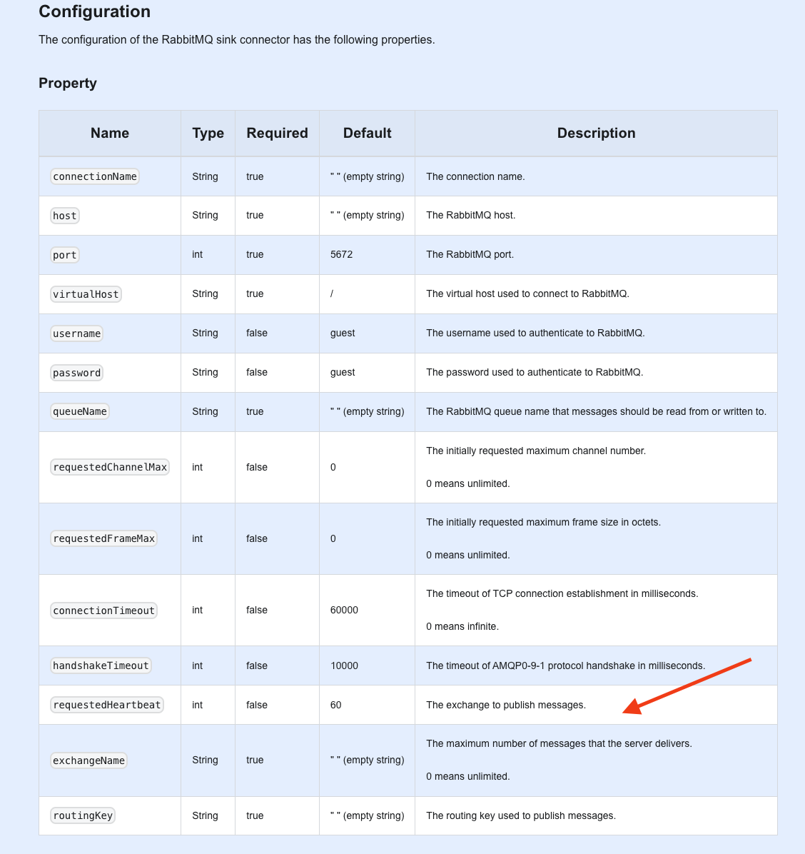 ### Search before asking - [X] I searched in the [issues](https://github.com/apache/pulsar/issues) and found nothing similar. ### What issue do you find in Pulsar docs? inaccurate ### What is your suggestion?  ### Any reference? requestedHeartbeat and exchangeName confgurations are mixed. Also (empty string) isn't quite user friendly imho. There are also a few configurations missing like exchangeType ### Are you willing to submit a PR? - [ ] I'm willing to submit a PR! -- This is an automated message from the Apache Git Service. To respond to the message, please log on to GitHub and use the URL above to go to the specific comment. To unsubscribe, e-mail: [email protected] For queries about this service, please contact Infrastructure at: [email protected]