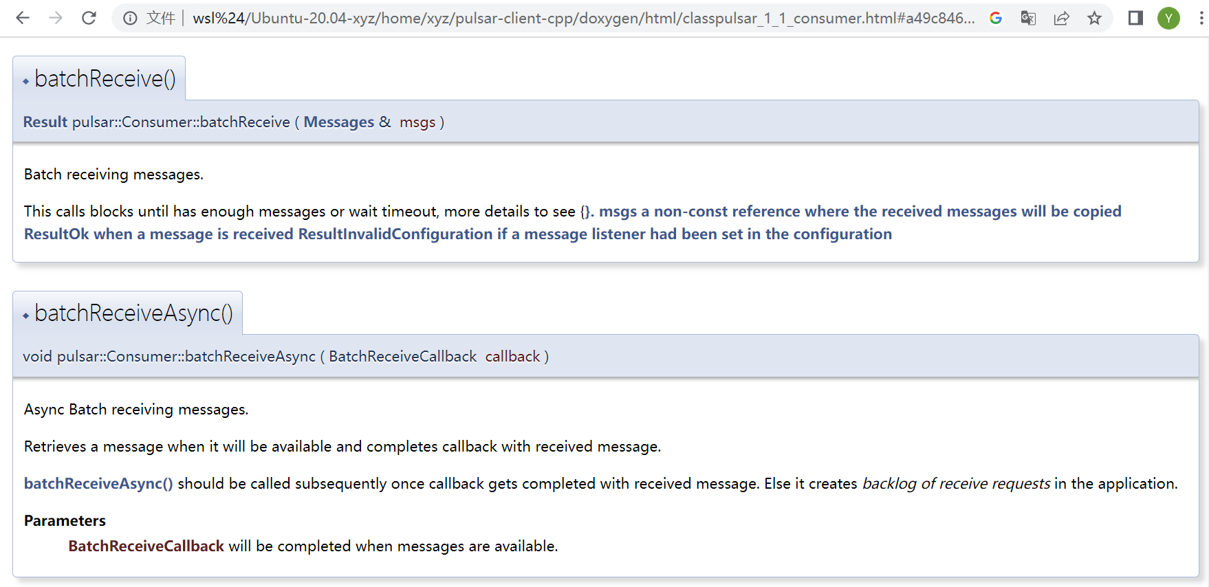 Here is the preview:  The main page seems to be outdated, but the API docs are latest, see the following screenshot, which includes the `batchReceive` API that was added recently  -- This is an automated message from the Apache Git Service. To respond to the message, please log on to GitHub and use the URL above to go to the specific comment. To unsubscribe, e-mail: [email protected] For queries about this service, please contact Infrastructure at: [email protected]