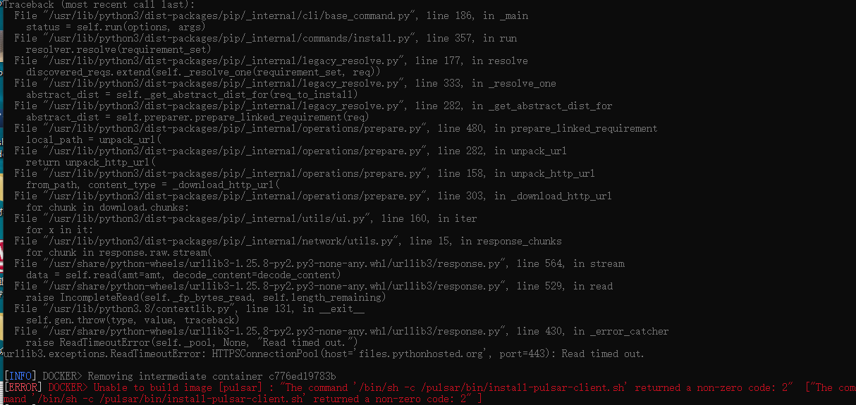 ### Motivation When I tried to build docker image by running `mvn package -Pdocker,-main -am -pl docker/pulsar-all -DskipTests`, after executing `RUN /pulsar/bin/install-pulsar-client.sh`, it shows urllib3.exceptions.ReadTimeoutError: HTTPSConnectionPool(host='files.pythonhosted.org', port=443): Read timed out.  and I get the response time from ping files.pythonhosted.org, the delay is not stable, sometimes 600ms, sometimes 64ms. When I failed this shell script by timeout, I changed the default timeout by adding `pip3 install --default-timeout=500 future`. So It's better to add a timeout threshold and annotations for pip3 install, it's friendly to beginners. ### Modifications Change default timeout for pip3 install Add annotations ### Verifying this change - [ ] Make sure that the change passes the CI checks. - [ ] ### Documentation - [ ] `doc` <!-- Your PR contains doc changes. Please attach the local preview screenshots (run `sh start.sh` at `pulsar/site2/website`) to your PR description, or else your PR might not get merged. --> - [ ] `doc-required` <!-- Your PR changes impact docs and you will update later --> - [x] `doc-not-needed` <!-- Your PR changes do not impact docs --> - [ ] `doc-complete` <!-- Docs have been already added --> -- This is an automated message from the Apache Git Service. To respond to the message, please log on to GitHub and use the URL above to go to the specific comment. To unsubscribe, e-mail: [email protected] For queries about this service, please contact Infrastructure at: [email protected]