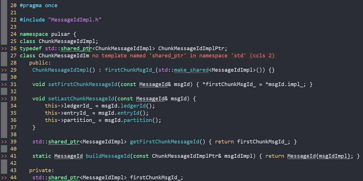 ########## lib/ChunkMessageIdImpl.h: ########## @@ -0,0 +1,46 @@ +/** + * Licensed to the Apache Software Foundation (ASF) under one + * or more contributor license agreements. See the NOTICE file + * distributed with this work for additional information + * regarding copyright ownership. The ASF licenses this file + * to you under the Apache License, Version 2.0 (the + * "License"); you may not use this file except in compliance + * with the License. You may obtain a copy of the License at + * + * http://www.apache.org/licenses/LICENSE-2.0 + * + * Unless required by applicable law or agreed to in writing, + * software distributed under the License is distributed on an + * "AS IS" BASIS, WITHOUT WARRANTIES OR CONDITIONS OF ANY + * KIND, either express or implied. See the License for the + * specific language governing permissions and limitations + * under the License. + */ + +#pragma once + +#include "MessageIdImpl.h" + +namespace pulsar { +class ChunkMessageIdImpl; +typedef std::shared_ptr<ChunkMessageIdImpl> ChunkMessageIdImplPtr; +class ChunkMessageIdImpl : public MessageIdImpl { + public: + ChunkMessageIdImpl() : firstChunkMsgId_(std::make_shared<MessageIdImpl>()) {} + + void setFirstChunkMessageId(const MessageId& msgId) { *firstChunkMsgId_ = *msgId.impl_; } + + void setLastChunkMessageId(const MessageId& msgId) { + this->ledgerId_ = msgId.ledgerId(); + this->entryId_ = msgId.entryId(); + this->partition_ = msgId.partition(); + } + + std::shared_ptr<MessageIdImpl> getFirstChunkMessageId() { return firstChunkMsgId_; } Review Comment: ```suggestion std::shared_ptr<MessageIdImpl> getFirstChunkMessageId() const { return firstChunkMsgId_; } ``` ########## lib/ChunkMessageIdImpl.h: ########## @@ -0,0 +1,46 @@ +/** + * Licensed to the Apache Software Foundation (ASF) under one + * or more contributor license agreements. See the NOTICE file + * distributed with this work for additional information + * regarding copyright ownership. The ASF licenses this file + * to you under the Apache License, Version 2.0 (the + * "License"); you may not use this file except in compliance + * with the License. You may obtain a copy of the License at + * + * http://www.apache.org/licenses/LICENSE-2.0 + * + * Unless required by applicable law or agreed to in writing, + * software distributed under the License is distributed on an + * "AS IS" BASIS, WITHOUT WARRANTIES OR CONDITIONS OF ANY + * KIND, either express or implied. See the License for the + * specific language governing permissions and limitations + * under the License. + */ + +#pragma once + +#include "MessageIdImpl.h" + +namespace pulsar { +class ChunkMessageIdImpl; +typedef std::shared_ptr<ChunkMessageIdImpl> ChunkMessageIdImplPtr; +class ChunkMessageIdImpl : public MessageIdImpl { + public: + ChunkMessageIdImpl() : firstChunkMsgId_(std::make_shared<MessageIdImpl>()) {} + + void setFirstChunkMessageId(const MessageId& msgId) { *firstChunkMsgId_ = *msgId.impl_; } + + void setLastChunkMessageId(const MessageId& msgId) { + this->ledgerId_ = msgId.ledgerId(); + this->entryId_ = msgId.entryId(); + this->partition_ = msgId.partition(); + } + + std::shared_ptr<MessageIdImpl> getFirstChunkMessageId() { return firstChunkMsgId_; } + + static MessageId buildMessageId(const ChunkMessageIdImplPtr& msgIdImpl) { return MessageId{msgIdImpl}; } Review Comment: Instead of the static method, we can just add a non-static method like: ```c++ MessageId build() const { return MessageId{std::dynamic_pointer_cast<MessageIdImpl>( std::const_pointer_cast<ChunkMessageIdImpl>(shared_from_this()))}; } ``` To have `shared_from_this()` method, you should inherit another class: ```c++ class ChunkMessageIdImpl : public MessageIdImpl, public std::enable_shared_from_this<ChunkMessageIdImpl> { ``` Then we can just use `chunkedMsgId->build()` instead of `ChunkedMessageIdImpl::buildMessage(chunkedMsgId);` ########## lib/ChunkMessageIdImpl.h: ########## @@ -0,0 +1,46 @@ +/** + * Licensed to the Apache Software Foundation (ASF) under one + * or more contributor license agreements. See the NOTICE file + * distributed with this work for additional information + * regarding copyright ownership. The ASF licenses this file + * to you under the Apache License, Version 2.0 (the + * "License"); you may not use this file except in compliance + * with the License. You may obtain a copy of the License at + * + * http://www.apache.org/licenses/LICENSE-2.0 + * + * Unless required by applicable law or agreed to in writing, + * software distributed under the License is distributed on an + * "AS IS" BASIS, WITHOUT WARRANTIES OR CONDITIONS OF ANY + * KIND, either express or implied. See the License for the + * specific language governing permissions and limitations + * under the License. + */ + +#pragma once + +#include "MessageIdImpl.h" Review Comment: ```suggestion #include <pulsar/MessageId.h> #include "MessageIdImpl.h" ``` The `MessageIdImpl.h` only includes the `<cstdint>` and `<string>` headers. Thought it doesn't cause the compilation failure because the files that include `ChunkMessageIdImpl.h` all have other necessary headers (like `<memory>` for `std::shared_ptr`) included, but there is a possibility that a new file that includes this header doesn't include these required headers. It could also make same static syntax analysis tool fail. See my Vim:  -- This is an automated message from the Apache Git Service. To respond to the message, please log on to GitHub and use the URL above to go to the specific comment. To unsubscribe, e-mail: [email protected] For queries about this service, please contact Infrastructure at: [email protected]
