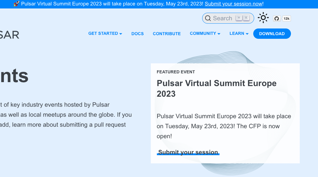 ### Documentation <!-- DO NOT REMOVE THIS SECTION. CHECK THE PROPER BOX ONLY. --> - [ ] `doc` <!-- Your PR contains doc changes. Please attach the local preview screenshots (run `./preview.sh` at root path) to your PR description, or else your PR might not get merged. --> - [ ] `doc-required` <!-- Your PR changes impact docs and you will update later --> - [x] `doc-not-needed` <!-- Your PR changes do not impact docs --> - [ ] `doc-complete` <!-- Docs have been already added --> Update the Pulsar website banner for Pulsar Summit Europe. Preview:  -- This is an automated message from the Apache Git Service. To respond to the message, please log on to GitHub and use the URL above to go to the specific comment. To unsubscribe, e-mail: [email protected] For queries about this service, please contact Infrastructure at: [email protected]