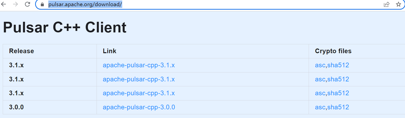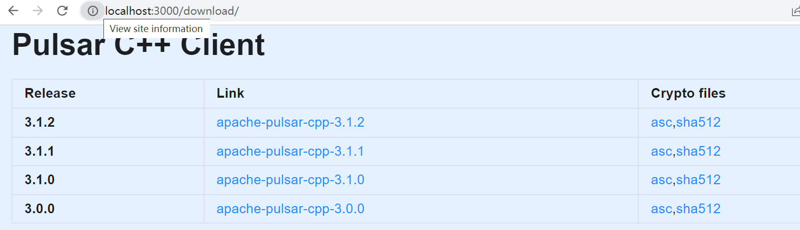 ### Documentation <!-- DO NOT REMOVE THIS SECTION. CHECK THE PROPER BOX ONLY. --> - [ ] `doc` <!-- Your PR contains doc changes. Please attach the local preview screenshots (run `./preview.sh` at root path) to your PR description, or else your PR might not get merged. --> - [ ] `doc-required` <!-- Your PR changes impact docs and you will update later --> - [x] `doc-not-needed` <!-- Your PR changes do not impact docs --> - [ ] `doc-complete` <!-- Docs have been already added --> The current C++ client download page is wrong, see:  It's because the table uses the `vtag` field to generate the **Release** and **Link** columns. https://github.com/apache/pulsar-site/blob/679b203bf481c552dde9d7dd4a932e7309e81d52/src/components/downloads.tsx#L177-L181 However, #419 set them as `3.1.x`. This PR updates the `vtag` fields, after the change the download page looks like:  -- This is an automated message from the Apache Git Service. To respond to the message, please log on to GitHub and use the URL above to go to the specific comment. To unsubscribe, e-mail: [email protected] For queries about this service, please contact Infrastructure at: [email protected]