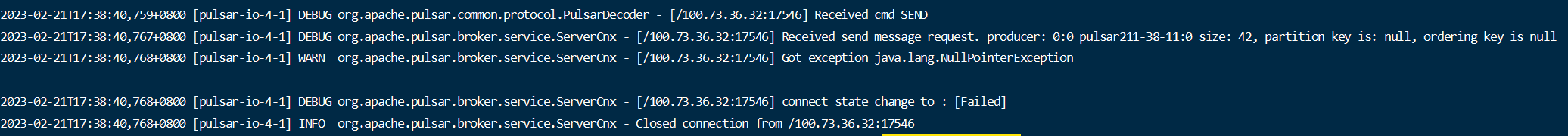 ### Motivation I meet a issue that NPE happend in ServerCnx.handleSend() but the debug log does not print stack trace.  ### Modifications print stack trace when got excpetion in ServerCnx ### Verifying this change - [ ] Make sure that the change passes the CI checks. This change is a trivial rework / code cleanup without any test coverage. ### Does this pull request potentially affect one of the following parts: <!-- DO NOT REMOVE THIS SECTION. CHECK THE PROPER BOX ONLY. --> *If the box was checked, please highlight the changes* - [ ] Dependencies (add or upgrade a dependency) - [ ] The public API - [ ] The schema - [ ] The default values of configurations - [ ] The threading model - [ ] The binary protocol - [ ] The REST endpoints - [ ] The admin CLI options - [ ] The metrics - [ ] Anything that affects deployment ### Documentation <!-- DO NOT REMOVE THIS SECTION. CHECK THE PROPER BOX ONLY. --> - [ ] `doc` <!-- Your PR contains doc changes. --> - [ ] `doc-required` <!-- Your PR changes impact docs and you will update later --> - [x] `doc-not-needed` <!-- Your PR changes do not impact docs --> - [ ] `doc-complete` <!-- Docs have been already added --> -- This is an automated message from the Apache Git Service. To respond to the message, please log on to GitHub and use the URL above to go to the specific comment. To unsubscribe, e-mail: [email protected] For queries about this service, please contact Infrastructure at: [email protected]