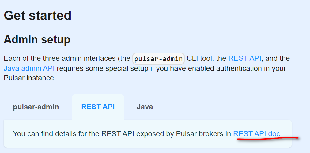 ### Search before asking - [X] I searched in the [issues](https://github.com/apache/pulsar/issues) and found nothing similar. ### What issue do you find in Pulsar docs? https://pulsar.apache.org/docs/2.11.x/admin-api-get-started/  The link with the red underline above is https://pulsar.apache.org/docs/2.11.x/admin-api-get-started/reference-rest-api-overview.md/, which references an invalid link. ### What is your suggestion? Maybe it should link to https://pulsar.apache.org/docs/2.11.x/reference-rest-api-overview/? ### Any reference? _No response_ ### Are you willing to submit a PR? - [ ] I'm willing to submit a PR! -- This is an automated message from the Apache Git Service. To respond to the message, please log on to GitHub and use the URL above to go to the specific comment. To unsubscribe, e-mail: [email protected] For queries about this service, please contact Infrastructure at: [email protected]