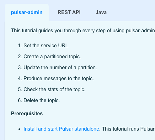 Thanks @Anonymitaet Can you check the links? It seems that some are broken. For example:  'Install and start Pulsar standalone' looks broken. This one also:  -- This is an automated message from the Apache Git Service. To respond to the message, please log on to GitHub and use the URL above to go to the specific comment. To unsubscribe, e-mail: [email protected] For queries about this service, please contact Infrastructure at: [email protected]