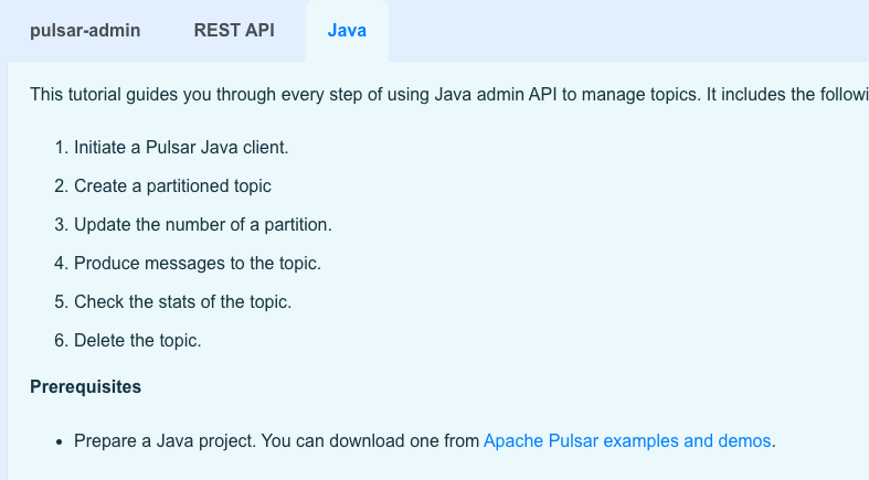 I could not find any Pulsar Java Admin API example in the provided repo. I suggest the following text instead: > Prepare a Java project. You can add the following dependency to your POM: ```xml <dependency> <groupId>org.apache.pulsar</groupId> <artifactId>pulsar-client-admin</artifactId> <version>2.11.0</version> </dependency> ``` -- This is an automated message from the Apache Git Service. To respond to the message, please log on to GitHub and use the URL above to go to the specific comment. To unsubscribe, e-mail: [email protected] For queries about this service, please contact Infrastructure at: [email protected]