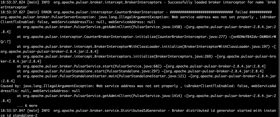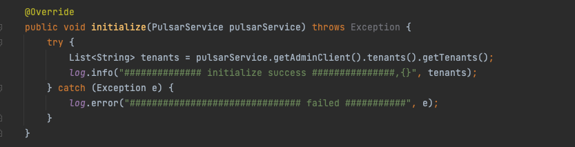 > @tisonkun In current version, just use case in test package. org.apache.pulsar.broker.intercept.CounterBrokerInterceptor. And add impl in initialize():  > > and use this as broker interceptor, when broker starts, we can get this error:  > > this is because when interceptors init, pulsar broker service is not ready. Could you please also add the above test to this patch? -- This is an automated message from the Apache Git Service. To respond to the message, please log on to GitHub and use the URL above to go to the specific comment. To unsubscribe, e-mail: [email protected] For queries about this service, please contact Infrastructure at: [email protected]