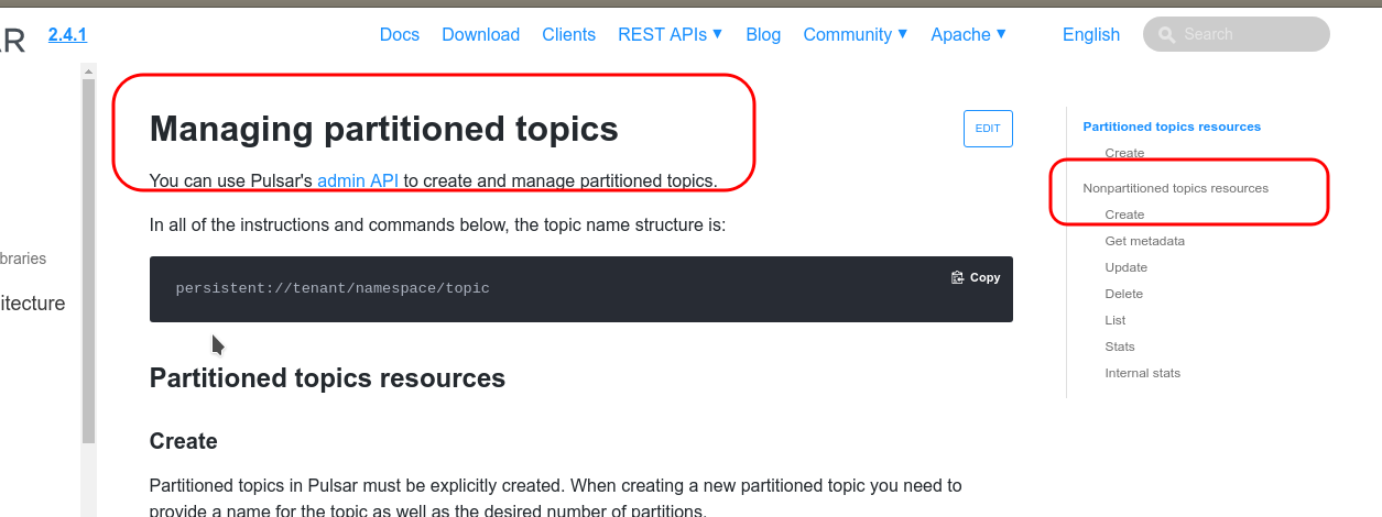 rocketraman opened a new issue #5142: [docs: Managing partitioned topics page has odd "Nonpartitioned topics resources" subheading URL: https://github.com/apache/pulsar/issues/5142 **Describe the bug** The docs about managing partitioned topics has an odd sub-heading "Nonpartitioned topics resources". However, everything under that sub-heading except the first "Create" sub-heading seems to be related to partitioned topics (as one would expect for this page). The "Nonpartitioned topics resources" and the "Create" subheading under that seem to be a copy/paste error or something.