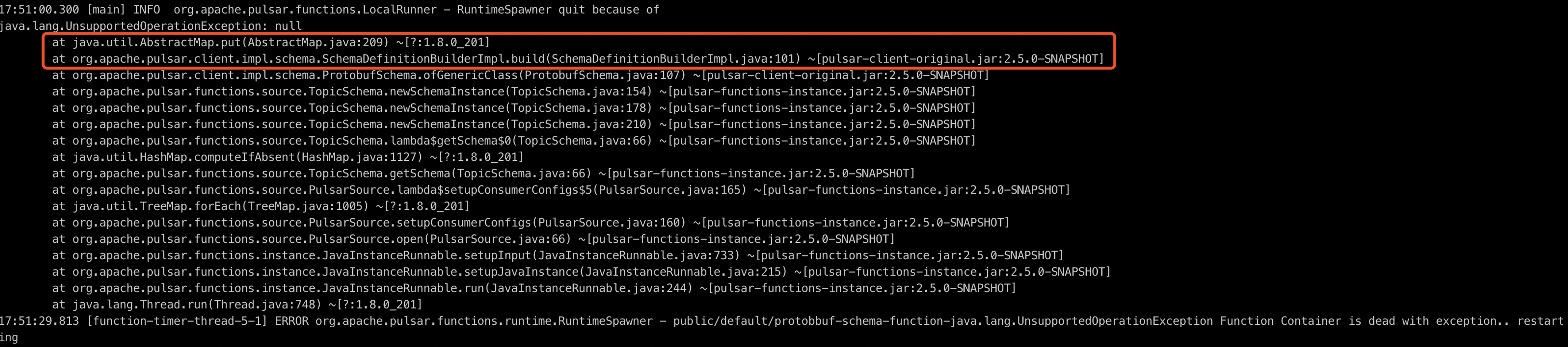 wolfstudy opened a new issue #5566: [Java Functions] Use protobuf schema error URL: https://github.com/apache/pulsar/issues/5566 **Describe the bug** I am trying to write a Java function using the `protobuf` schema, code as follows: ``` package functions; import pb.TestOuterClass; import java.util.function.Function; public class ExampleProtoSchemaFunction implements Function<pb.TestOuterClass.Test, String> { @Override public String apply(TestOuterClass.Test test) { System.out.println(test.getMsf()); System.out.println(test.getNum()); return "test proto schema of function"; } } ``` proto definition as follows: ``` syntax = "proto3"; package pb; message Test { int32 num = 1; string msf = 2; } ``` Create a function with the following command: ``` ./bin/pulsar-admin functions localrun --name protobbuf-schema-function --tenant public --namespace default --inputs input-topic-1 --jar mysql-sink-io-tests-1.0-SNAPSHOT.jar --output output-topic --classname functions.ExampleProtoSchemaFunction ``` I have encountered the following error: ``` 17:51:00.300 [main] INFO org.apache.pulsar.functions.LocalRunner - RuntimeSpawner quit because of java.lang.UnsupportedOperationException: null at java.util.AbstractMap.put(AbstractMap.java:209) ~[?:1.8.0_201] at org.apache.pulsar.client.impl.schema.SchemaDefinitionBuilderImpl.build(SchemaDefinitionBuilderImpl.java:101) ~[pulsar-client-original.jar:2.5.0-SNAPSHOT] at org.apache.pulsar.client.impl.schema.ProtobufSchema.ofGenericClass(ProtobufSchema.java:107) ~[pulsar-client-original.jar:2.5.0-SNAPSHOT] at org.apache.pulsar.functions.source.TopicSchema.newSchemaInstance(TopicSchema.java:154) ~[pulsar-functions-instance.jar:2.5.0-SNAPSHOT] at org.apache.pulsar.functions.source.TopicSchema.newSchemaInstance(TopicSchema.java:178) ~[pulsar-functions-instance.jar:2.5.0-SNAPSHOT] at org.apache.pulsar.functions.source.TopicSchema.newSchemaInstance(TopicSchema.java:210) ~[pulsar-functions-instance.jar:2.5.0-SNAPSHOT] at org.apache.pulsar.functions.source.TopicSchema.lambda$getSchema$0(TopicSchema.java:66) ~[pulsar-functions-instance.jar:2.5.0-SNAPSHOT] at java.util.HashMap.computeIfAbsent(HashMap.java:1127) ~[?:1.8.0_201] at org.apache.pulsar.functions.source.TopicSchema.getSchema(TopicSchema.java:66) ~[pulsar-functions-instance.jar:2.5.0-SNAPSHOT] at org.apache.pulsar.functions.source.PulsarSource.lambda$setupConsumerConfigs$5(PulsarSource.java:165) ~[pulsar-functions-instance.jar:2.5.0-SNAPSHOT] at java.util.TreeMap.forEach(TreeMap.java:1005) ~[?:1.8.0_201] at org.apache.pulsar.functions.source.PulsarSource.setupConsumerConfigs(PulsarSource.java:160) ~[pulsar-functions-instance.jar:2.5.0-SNAPSHOT] at org.apache.pulsar.functions.source.PulsarSource.open(PulsarSource.java:66) ~[pulsar-functions-instance.jar:2.5.0-SNAPSHOT] at org.apache.pulsar.functions.instance.JavaInstanceRunnable.setupInput(JavaInstanceRunnable.java:733) ~[pulsar-functions-instance.jar:2.5.0-SNAPSHOT] at org.apache.pulsar.functions.instance.JavaInstanceRunnable.setupJavaInstance(JavaInstanceRunnable.java:215) ~[pulsar-functions-instance.jar:2.5.0-SNAPSHOT] at org.apache.pulsar.functions.instance.JavaInstanceRunnable.run(JavaInstanceRunnable.java:244) ~[pulsar-functions-instance.jar:2.5.0-SNAPSHOT] at java.lang.Thread.run(Thread.java:748) ~[?:1.8.0_201] 17:51:29.813 [function-timer-thread-5-1] ERROR org.apache.pulsar.functions.runtime.RuntimeSpawner - public/default/protobbuf-schema-function-java.lang.UnsupportedOperationException Function Container is dead with exception.. restarting ``` **To Reproduce** Build java function using the code example provided above. **Expected behavior** Java function was successfully created **Screenshots**  **Desktop (please complete the following information):** - OS: Mac OS - Pulsar: 2.4.1 **Additional context** Through the error message, we can locate [SchemaDefinitionBuilderImpl#101](https://github.com/apache/pulsar/blob/master/pulsar-client/src/main/java/org/apache/pulsar/client/impl/schema/SchemaDefinitionBuilderImpl.java#L101) When I delete this line of code, this function is created successfully.
