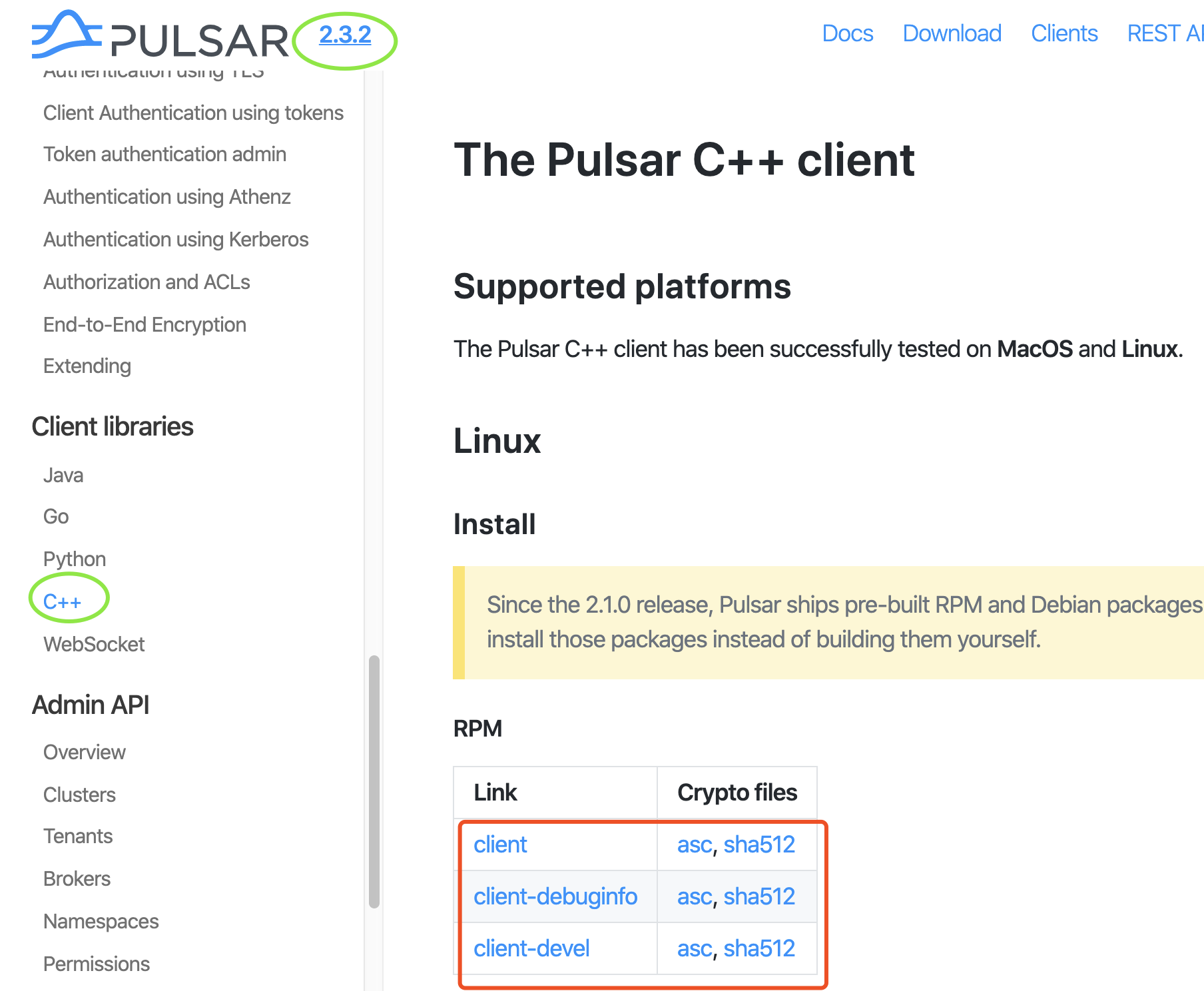 Anonymitaet commented on issue #5839: [Doc] Variable issues in website download links URL: https://github.com/apache/pulsar/issues/5839#issuecomment-575430389 @tuteng seems that this issue is not resolved. ### Incorrect example 1 After clicking the contents in the red boxes (https://pulsar.apache.org/docs/en/2.3.2/client-libraries-cpp/), I got a `404 Not Found` error.  ### Incorrect example 2 After clicking `downloads page`, I got a `404 Not Found` error.  It seems that the variable `pulsar:download_page_ur` should be reset to redirect to a correct destination.  Could you please help? Thanks