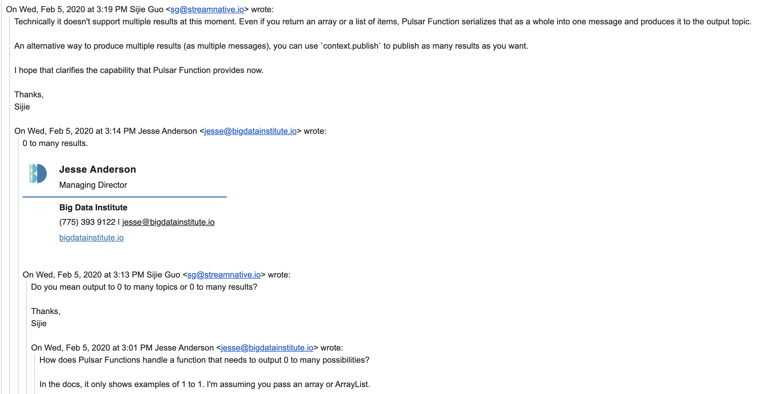 Anonymitaet opened a new issue #6243: [Doc] Add explanations for function can output one or multiple results URL: https://github.com/apache/pulsar/issues/6243 https://streaml.io/blog/eda-event-processing-design-patterns-with-pulsar-functions