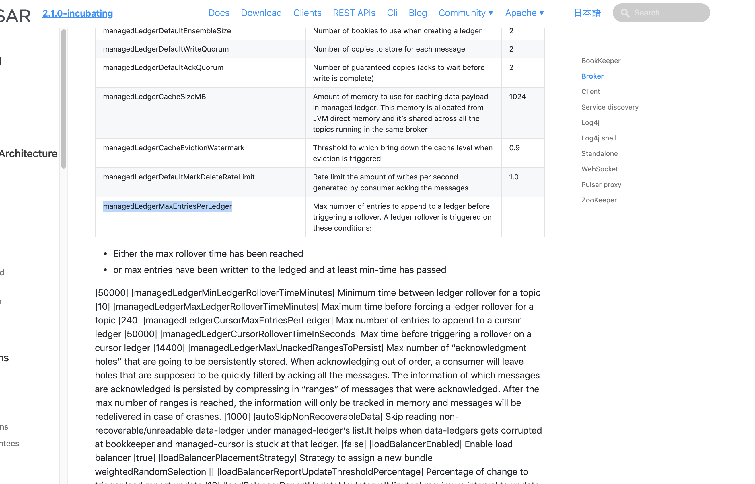 **Describe the bug** The configuration reference for broker settings at https://pulsar.apache.org/docs/ja/2.1.0-incubating/reference-configuration/ has a formatting issue which breaks the table for the broker settings. **To Reproduce** Steps to reproduce the behavior: 1. Go to https://pulsar.apache.org/docs/ja/2.1.0-incubating/reference-configuration/ 2. Scroll down to managedLedgerMaxEntriesPerLedger 3. Observe that table formatting breaks shortly after the bulleted list for managedLedgerMaxEntriesPerLedger conditions. **Expected behavior** The table should not be misformatted. **Screenshots**  **Desktop (please complete the following information):** - OS: Mac OSX **Additional context** Issue is visible in Chrome and Safari. ---------------------------------------------------------------- This is an automated message from the Apache Git Service. To respond to the message, please log on to GitHub and use the URL above to go to the specific comment. For queries about this service, please contact Infrastructure at: [email protected]