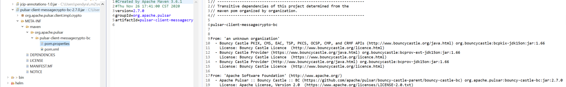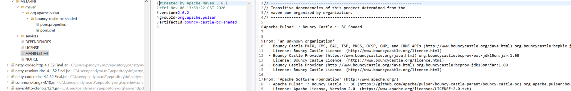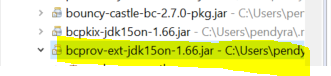 thank you. Update to the issue: It is now successful using a different dependency which is bouncy castle and the connection is working with encryption enabled. However, there are black duck security vulnerabilities being reported. Using 2.6.2 client Bouncy castle jar file, an inner jar of pulsar client has some internal transitive dependencies with 1.6.0 version of bouncy castle which is causing the HIGH vulnerabilities. Using 2.7.0 High vulnerability is removed but it has 1 CRITICAL vulnerability with the new transitive dependency jar (bcprov-ext-jdk15on-1.66.jar     What can we do to resolve this vulverability? Thanks again. ---------------------------------------------------------------- This is an automated message from the Apache Git Service. To respond to the message, please log on to GitHub and use the URL above to go to the specific comment. For queries about this service, please contact Infrastructure at: [email protected]