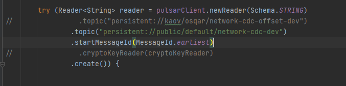 User has set up reader to look for earliest message. Attached is how that is configured along with client log.   Some log information from broker. 13:56:59.135 [pulsar-ordered-OrderedExecutor-7-0-EventThread] INFO org.apache.pulsar.broker.service.persistent.PersistentTopic - [persistent://kaov/osqar/network-cdc-offset-dev][reader-fa7825c9ae] Creating non-durable subscription at msg id -1:-1:-1:-1 13:56:59.136 [pulsar-ordered-OrderedExecutor-7-0-EventThread] INFO org.apache.bookkeeper.mledger.impl.NonDurableCursorImpl - [kaov/osqar/persistent/network-cdc-offset-de ] Created non-durable cursor read-position=13291496:0 mark-delete-position=13291496:-1 13:56:59.136 [pulsar-ordered-OrderedExecutor-7-0-EventThread] INFO org.apache.bookkeeper.mledger.impl.ManagedLedgerImpl - [kaov/osqar/persistent/network-cdc-offset-dev] Opened new cursor: NonDurableCursorImpl{ledger=kaov/osqar/persistent/network-cdc-offset-dev, ackPos=13291496:-1, readPos=13291496:0} Thanks again. ---------------------------------------------------------------- This is an automated message from the Apache Git Service. To respond to the message, please log on to GitHub and use the URL above to go to the specific comment. For queries about this service, please contact Infrastructure at: [email protected]