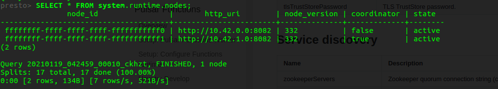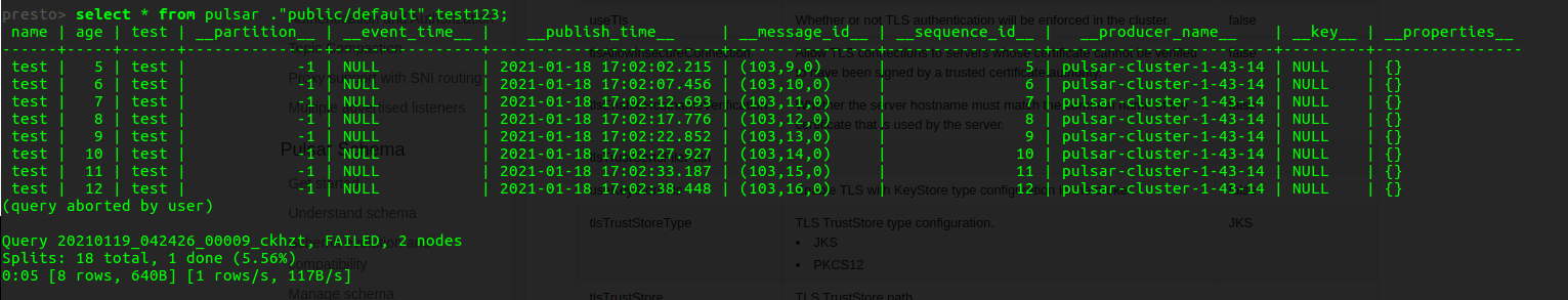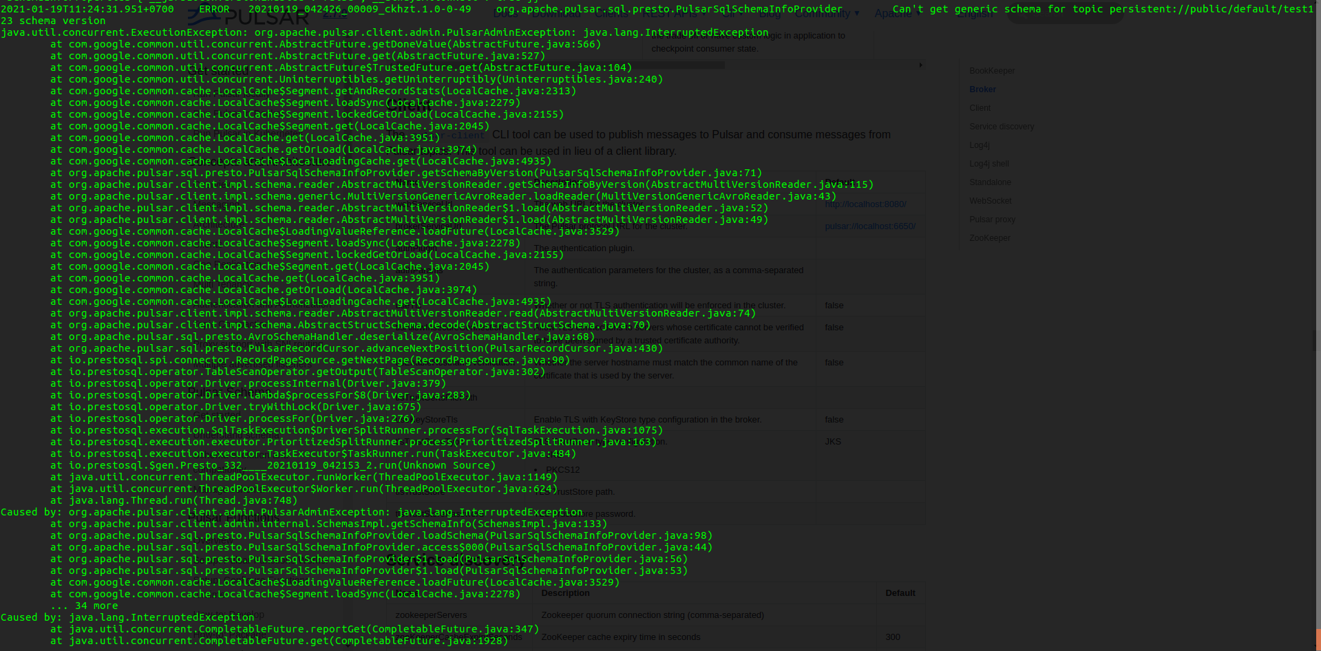 i built a cluster of prestosql with 2 nodes, 1 node coordinator, and the other is worker. I produced the messages with AVRO schema to a topic, and then using prestosql to query in my brokers. The coordinator loaded schema, read data and responsed to presto is fine, but worker is error, can't load generic schema. I tried to switch role of 2 nodes and the node of coordinator (before is worker being error) is worked fine, and the node of worker (before is coordinator being fine) is error. The result of request still work because of cooridnator processing all requests, not worker. How to fix that ?? Coordinator load schema is fine  Worker load schema is error  Data and presto cluster   ---------------------------------------------------------------- This is an automated message from the Apache Git Service. To respond to the message, please log on to GitHub and use the URL above to go to the specific comment. For queries about this service, please contact Infrastructure at: [email protected]
