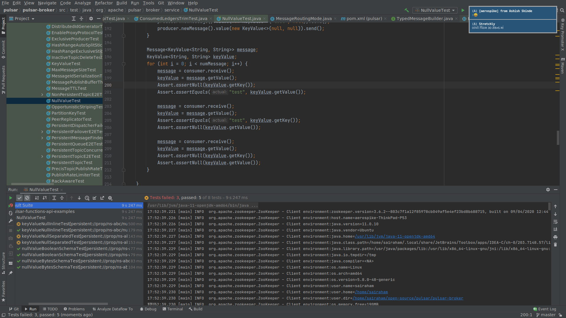**Describe the bug** Tests of class org.apache.pulsar.broker.service.NullValueTest are randomly failing. I tried running it from Intellij IDEA. Test output seems nondeterministic. Not sure what is wrong. **To Reproduce** Steps to reproduce the behavior: 1. Run tests from the IDE. CLI can also reproduce the same behaviour. **Expected behavior** A deterministic success or failure output of the tests. **Screenshots**   If you see the screenshots, both the test run has different test outputs. -- This is an automated message from the Apache Git Service. To respond to the message, please log on to GitHub and use the URL above to go to the specific comment. For queries about this service, please contact Infrastructure at: [email protected]