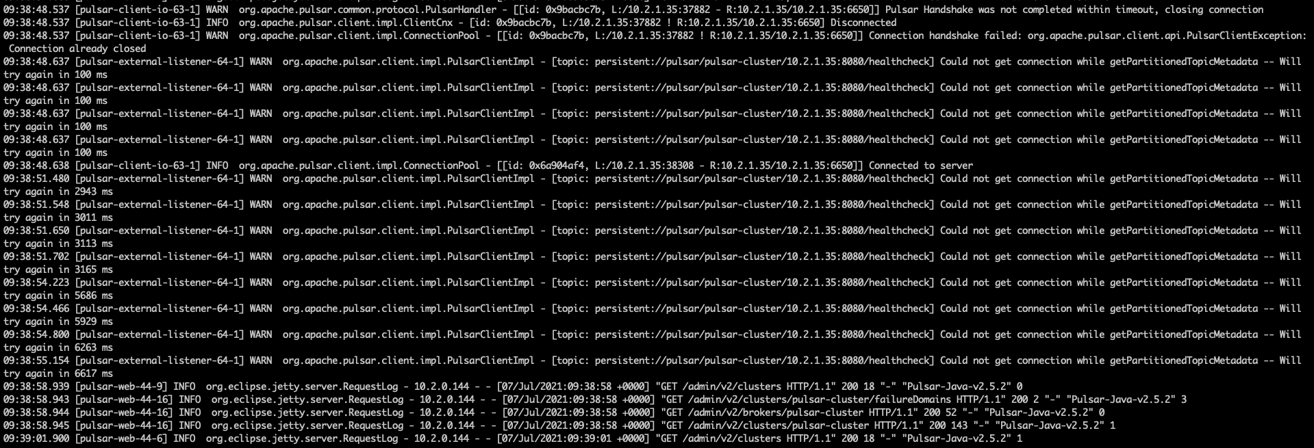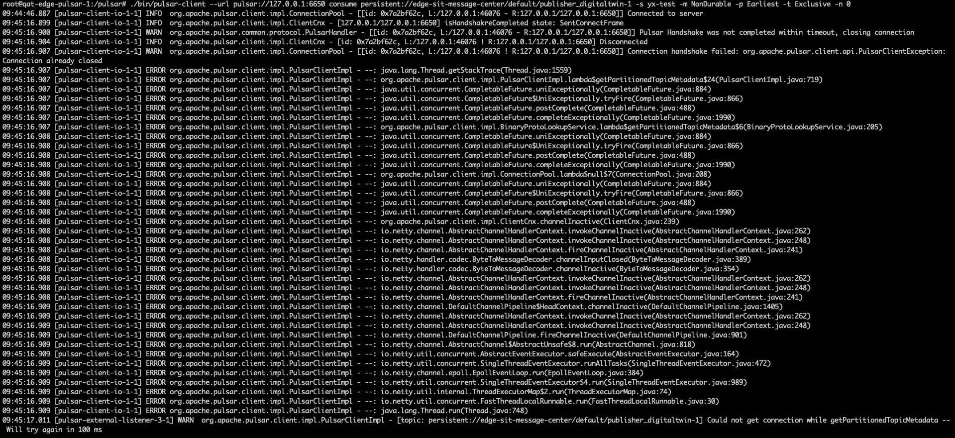我有三个 pulsar broker 节点,但是经常遇到部分 broker 节点 6650 端口服务不可用。节点故障情况下, 从 broker 的日志可以看出 healthcheck 一直处于失败的状态。healthcheck 失败的原因,我判断就是 handshake timeout,下面会贴具体日志。 另外我发现即使 broker 节点不可用,但是其 8080 端口依旧能正常提供服务,可以执行 ./bin/pulsar-admin persistent get-partitioned-topic-metadata persistent://pulsar/pulsar-cluster/10.2.1.26:8080/healthcheck 命令,也能获取到正确的结果,所以只有 6650 端口服务异常。 我通过在故障 broker 节点,通过 tcpdump 抓取 6650 端口报文,发现 pulsar client 和 pulsar broker 可以正常建立 tcp 连接,但是 pulsar client 发送了一笔 tcp data 后,pulsar broker 只会返回 tcp ack ,接下来 pulsar broker 没有任何 tcp 报文。我在 pulsar client 里面加日志,也如期的发现 pulsar client 连接一直处于 SentConnectFrame 状态。等上 30s 后,连接都超时异常。 pulsar broker 日志:  pulsar client 日志:  -- This is an automated message from the Apache Git Service. To respond to the message, please log on to GitHub and use the URL above to go to the specific comment. To unsubscribe, e-mail: [email protected] For queries about this service, please contact Infrastructure at: [email protected]