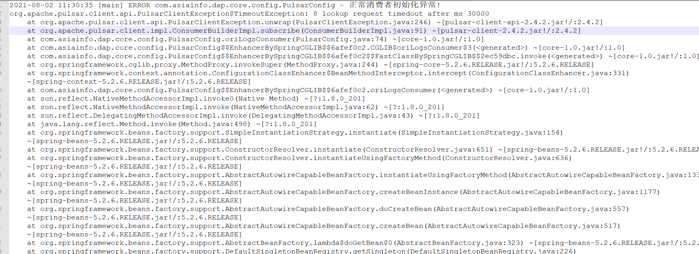 pulsar版本2.4.0 启动消费者,订阅某个topic,初始化报错,启动报错 org.apache.pulsar.client.api.PulsarClientException$TimeoutException: 8 lookup request timedout after ms 30000  更换topic,初始化成功, -- This is an automated message from the Apache Git Service. To respond to the message, please log on to GitHub and use the URL above to go to the specific comment. To unsubscribe, e-mail: [email protected] For queries about this service, please contact Infrastructure at: [email protected]