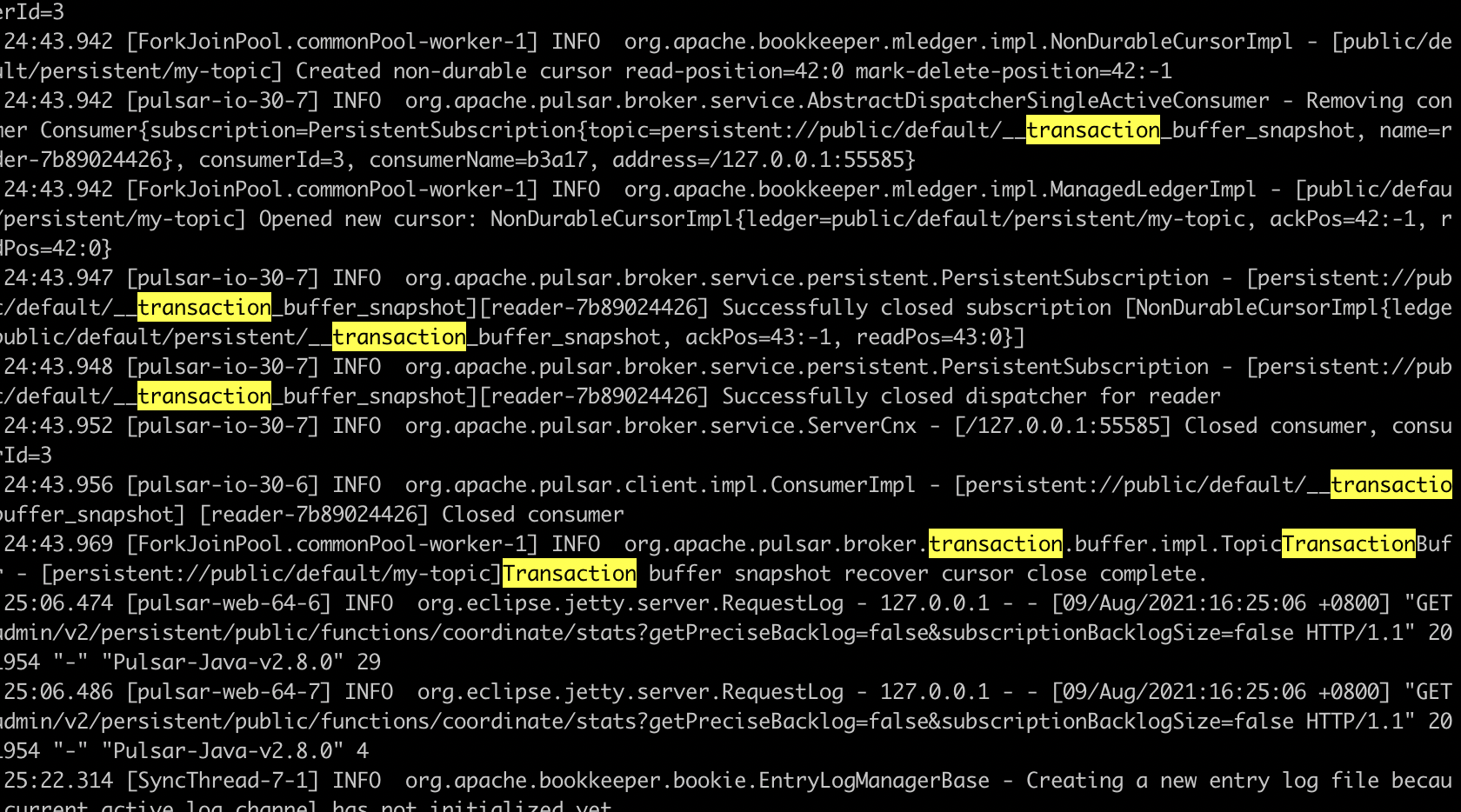 It seems ok  I think __transaction_buffer_snapshot can mean that transaction is ok. -- This is an automated message from the Apache Git Service. To respond to the message, please log on to GitHub and use the URL above to go to the specific comment. To unsubscribe, e-mail: [email protected] For queries about this service, please contact Infrastructure at: [email protected]