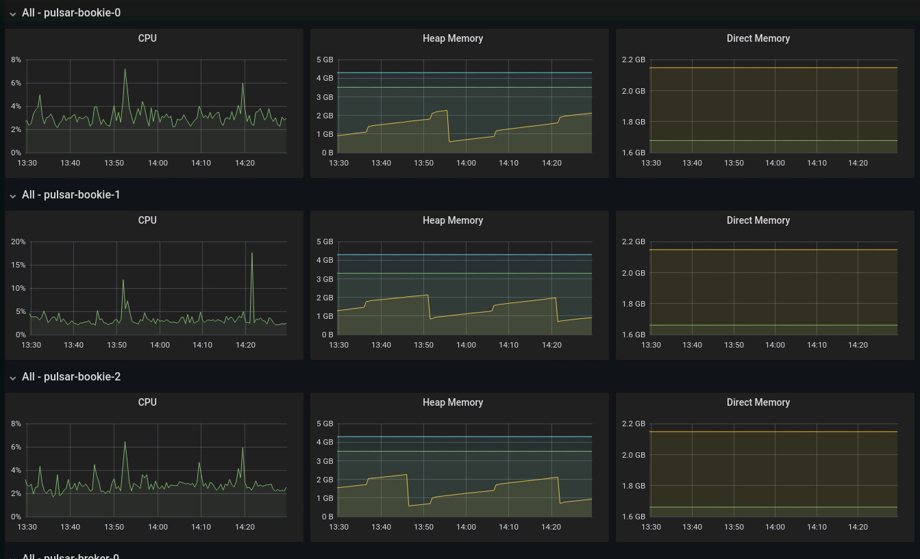 K8S metrics give me the CPU/ RAM comsumption of my 3 bookies pods :