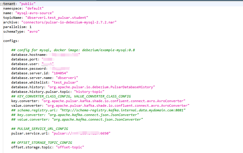 @congbobo184 source的配置  avro配置 { "type": "AVRO", "schema": "{\"type\":\"record\",\"name\":\"Test\",\"fields\":[{\"name\":\"id\",\"type\":[\"null\",\"int\"]},{\"name\":\"name\",\"type\":[\"null\",\"string\"]}]}", "properties": {} } -- This is an automated message from the Apache Git Service. To respond to the message, please log on to GitHub and use the URL above to go to the specific comment. To unsubscribe, e-mail: [email protected] For queries about this service, please contact Infrastructure at: [email protected]