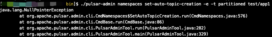 ### Motivation When I execute the `set-auto-topic-creation` command on namesapce to specify `-e` and specify `-t` as _**partitioned**_ but not specify -n, an NPE will occur. as below, `./pulsar-admin namespaces set-auto-topic-creation -e -t partitioned test/app1`  ### Documentation - no-need-doc -- This is an automated message from the Apache Git Service. To respond to the message, please log on to GitHub and use the URL above to go to the specific comment. To unsubscribe, e-mail: [email protected] For queries about this service, please contact Infrastructure at: [email protected]