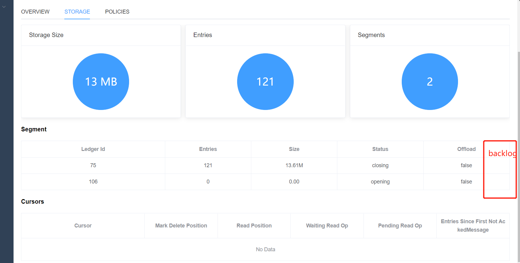 **Is your feature request related to a problem? Please describe.** At present, when the disk space of bookie cannot be released, you can only view the topic subscription's backlog or the partition's backlog, but there are several ledgers in a partition. You don't know which ledger the backlog is stuck on. **Describe the solution you'd like** Add backlog on ledger.  -- This is an automated message from the Apache Git Service. To respond to the message, please log on to GitHub and use the URL above to go to the specific comment. To unsubscribe, e-mail: [email protected] For queries about this service, please contact Infrastructure at: [email protected]