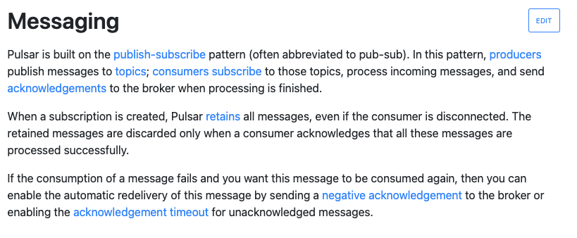 ### What issue do you find in Pulsar docs? There are two broken links on the following [page](https://pulsar.apache.org/docs/en/concepts-messaging/) The links to [negative acknowledgement](https://pulsar.apache.org/docs/en/concepts-messaging/negative-acknowledgement) and [acknowledgement timeout](https://pulsar.apache.org/docs/en/concepts-messaging/acknowledgement-timeout) are broken and return 404s ### What is your suggestion? Fix the broken links to point to the correct pages ### Do you have any references?  ### Would you like to fix this issue? Maybe ### Note - [X] I have researched my question. -- This is an automated message from the Apache Git Service. To respond to the message, please log on to GitHub and use the URL above to go to the specific comment. To unsubscribe, e-mail: [email protected] For queries about this service, please contact Infrastructure at: [email protected]