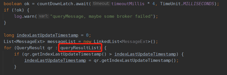 Thanks. Main thead is blocked by countDownLatch until sub thead complete. The countDownLatch will goes zero, countDownLatch.await(timeoutMillis * 4, TimeUnit.MILLISECONDS) execute immediately. The query this.mQClientFactory.getMQClientAPIImpl().queryMessage(addr, requestHeader, timeoutMillis * 3 is timeoutMillis * 3,and the countDownLatch.await is timeoutMillis * 4. 2022-10-24_090335 2022-10-24_090408 > Hi @codersfarm , IMO, I think the countDownLatch will goes zero whether the broker failed or not. And i think the purpose of this `await()` method is to wait for the for loop to complete so that the `queryResultList` results of querying all brokers can be retrieved. The `queryResultList` is incomplete without the `await()` method waiting for the completion of the for loop. > >   -- This is an automated message from the Apache Git Service. To respond to the message, please log on to GitHub and use the URL above to go to the specific comment. To unsubscribe, e-mail: [email protected] For queries about this service, please contact Infrastructure at: [email protected]
