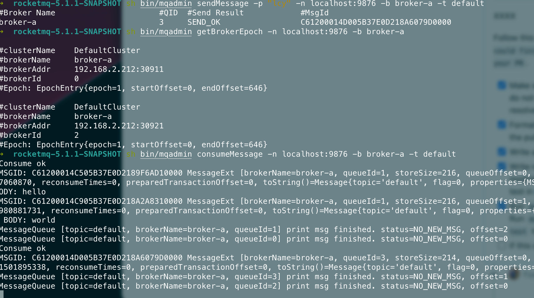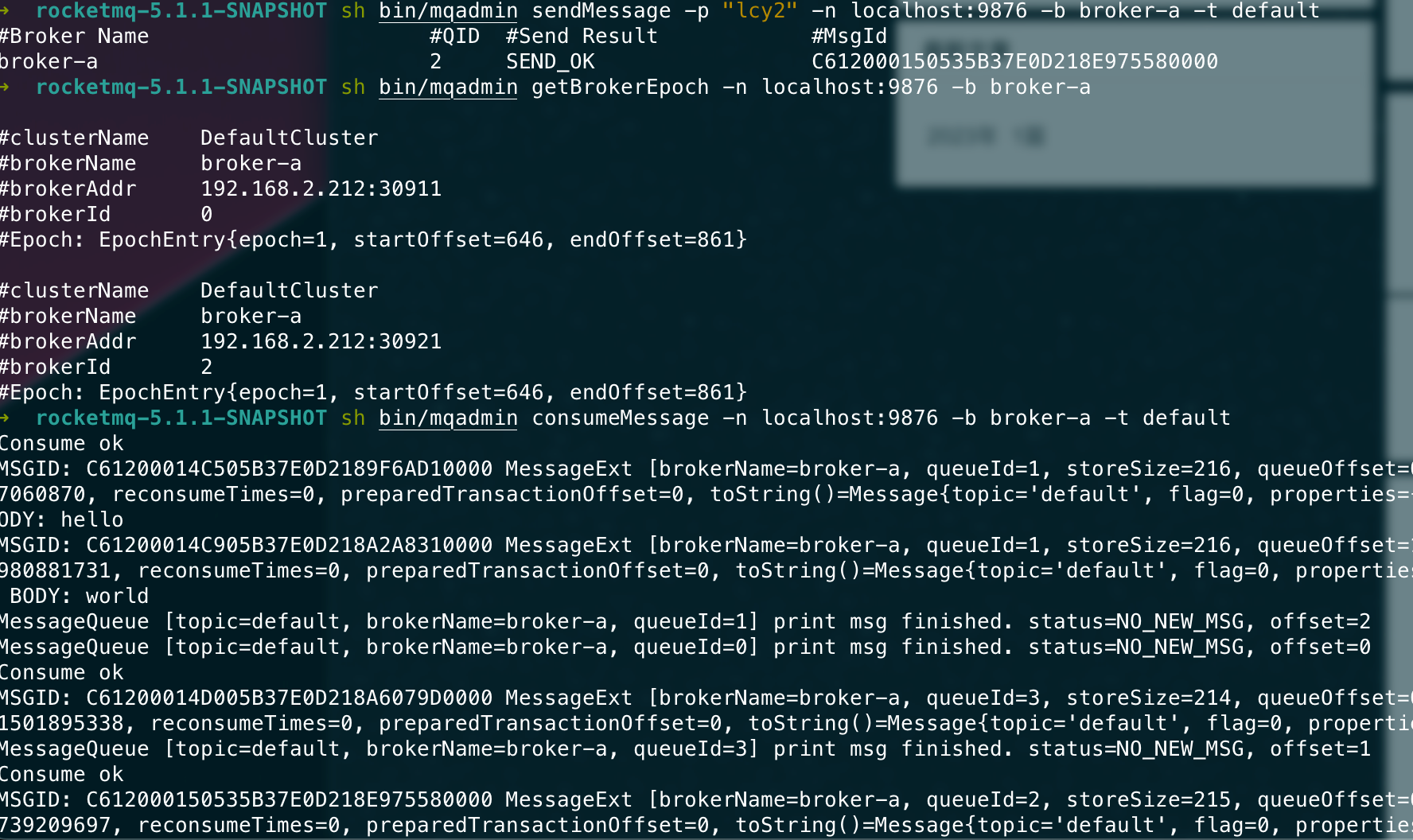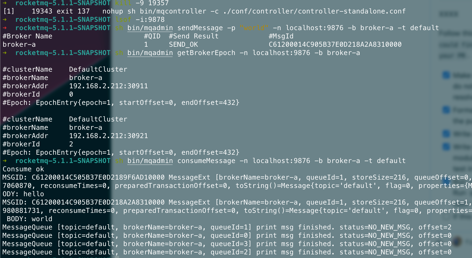 ## 升级方案 5.0以下版本升级则遵守之前的升级步骤。 5.0以上版本升级需要遵守以下步骤。 ### 升级controller 由于我们在controller里面更改了许多状态机的内部属性以及新版的brokerId分配的逻辑,因此controller需要进行升级。 1. 将旧版本Controller下线。 2. 清除Controller数据,也就是DLedger的数据文件,默认路径在`~/DLedgerController` 3. 上线新版本Controller。 ### 升级Broker 1. 将Broker从节点停机。 2. 将Broker主节点停机。 3. 将所有Broker的Epoch文件删除,即默认`~/store/epochFileCheckpoint`和`~/store/epochFileCheckpoint.bak`。 4. 将原来的主Broker先上线,等待该Broker成功当选为master。(可用admin命令`getSyncState`来检测) 5. 将原来的从Broker全部上线。 ### 测试 > 启动一个namesrv ```bash nohup sh bin/mqnamesrv & ``` > 启动一个旧版controller ```bash nohup sh bin/mqcontroller -c ./conf/controller/controller-standalone.conf & ``` > 查看controller是否被正确启动 ```bash sh bin/mqadmin getControllerMetaData -a localhost:9878 ```  > 先后启动旧版broker0和broker1 ```bash nohup sh bin/mqbroker -c conf/controller/quick-start/broker-n0.conf & ``` ```bash nohup sh bin/mqbroker -c conf/controller/quick-start/broker-n1.conf & ``` > 查看集群情况 ```bash sh bin/mqadmin getSyncStateSet -a localhost:9878 -b broker-a ```  > 发送消息 ```bash sh bin/mqadmin sendMessage -p "hello" -n localhost:9876 -b broker-a -t default ```  > 检查两个节点是否正确append ```bash sh bin/mqadmin getBrokerEpoch -n localhost:9876 -b broker-a ```  > controller下线 将controller进程杀死。 测试此时是否可以正常收发消息。  > 清除controller数据文件  > 上线新版controller  > 检查当前是否正常收发消息  > 分别将broker的从节点和主节点先后停机  > 清除每个broker的epoch文件  > 将原来的主broker先更新上线  > 从broker更新上线  > 测试收发消息  > 上线一个新节点broker2  > 下线broker0,触发切主  broker1成为master > 下线broker1,触发切主  > 测试消息收发  > 重启broker0和broker1 <img width="806" alt="image" src="https://user-images.githubusercontent.com/87409330/223159422-142bc372-be99-4440-95ba-9bf222bffd6c.png"> ### 兼容性 | | 5.0旧Controller | 新Controller | | --- | --- | --- | | 5.0旧Broker | 正常运行,可切换 | 若已主备确定则可正常运行,不可切换。若broker重新启动则无法上线 | | 新Broker | 无法正常上线 | 正常运行,可切换 | -- This is an automated message from the Apache Git Service. To respond to the message, please log on to GitHub and use the URL above to go to the specific comment. To unsubscribe, e-mail: [email protected] For queries about this service, please contact Infrastructure at: [email protected]